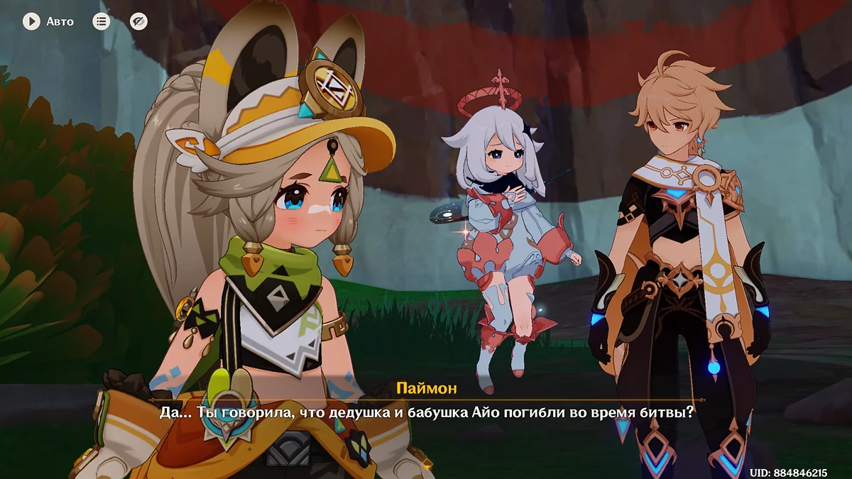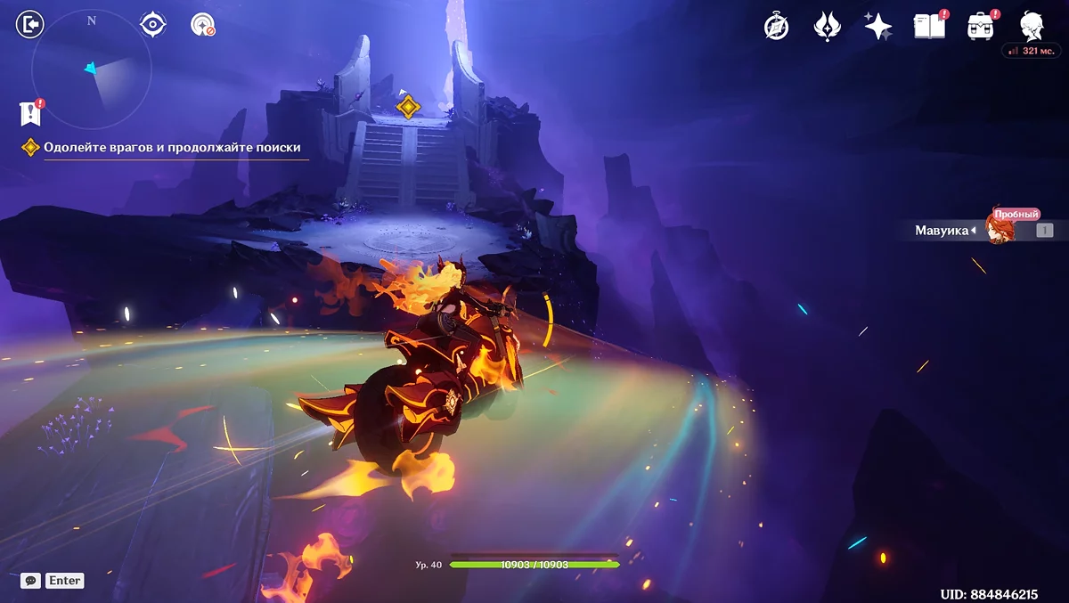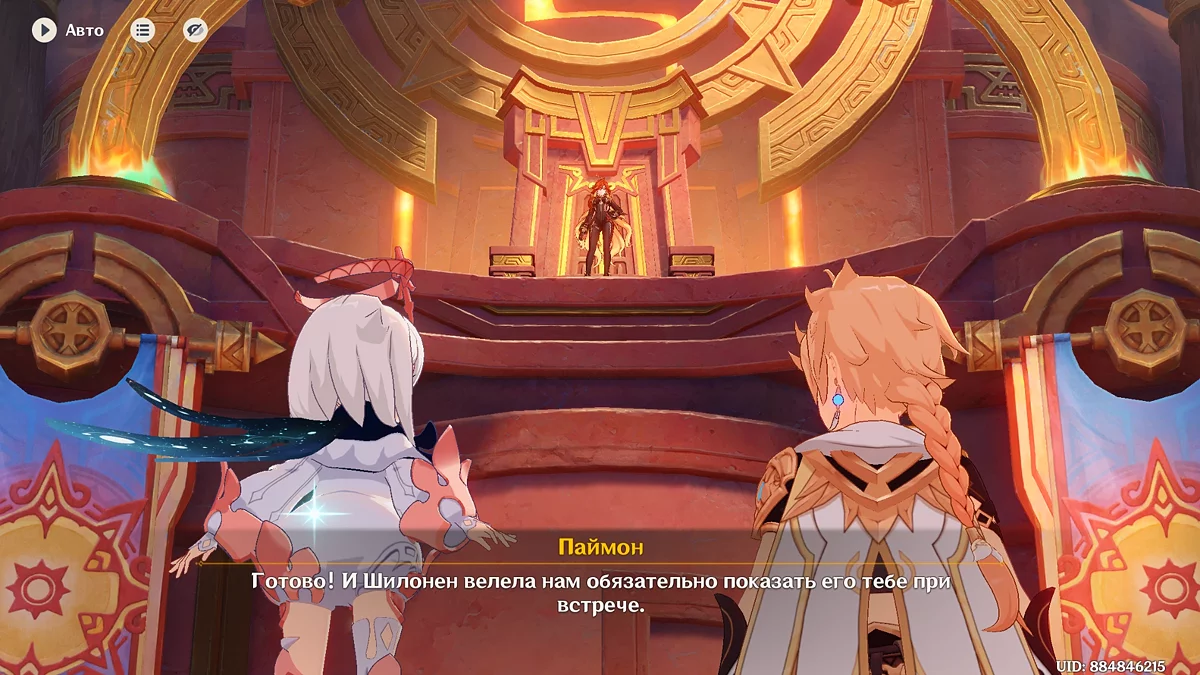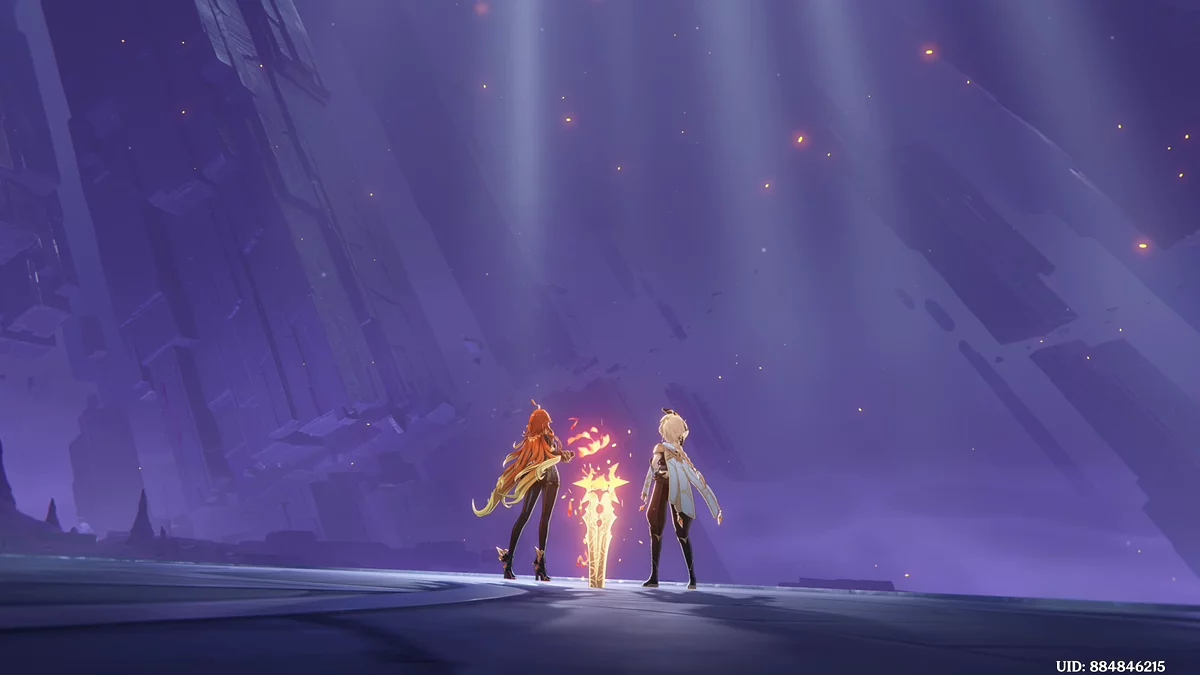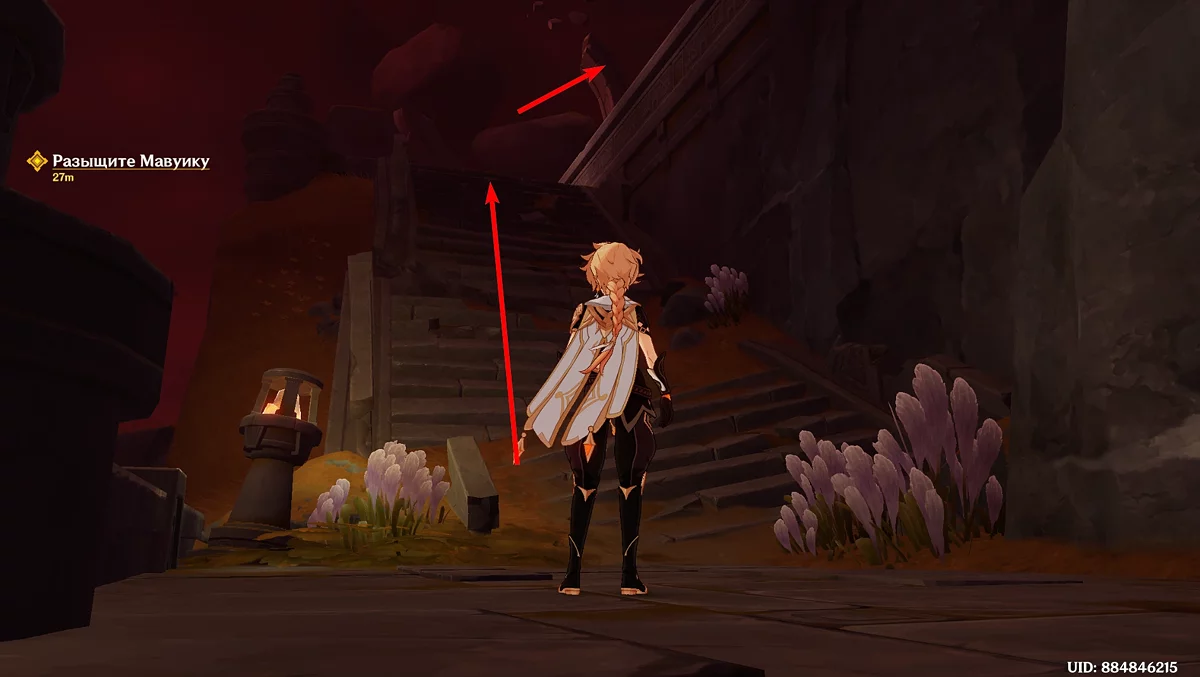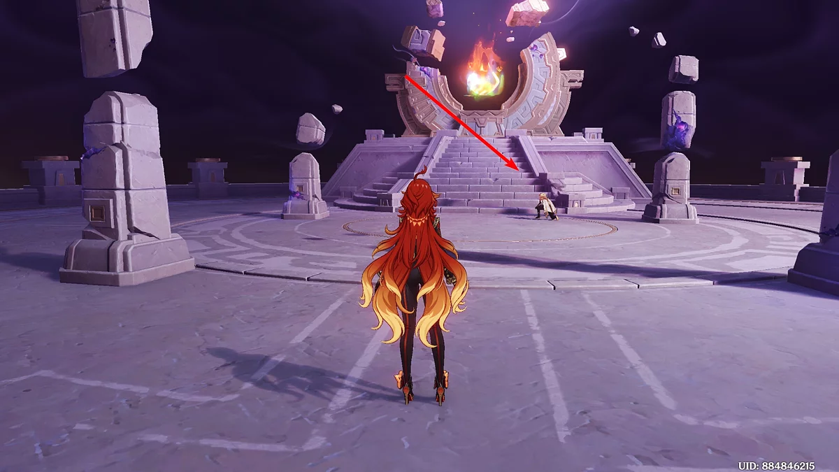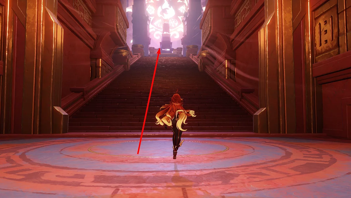 Po przejściu do przodu, aktywna postać zmieni się na Mavuikę. Idź naprzód i pokonaj dwa mimiflory. Użyj umiejętności bohaterki, aby szybciej pokonać wrogów. Idąc dalej, skocz na duchową ścieżkę (wcześniej aktywując cykl płomieni). Pokonaj Cryo Abyss Mage'a i kontynuuj. Mavuika porozmawia ze swoją siostrą Hini i ruszy dalej. Następnie akcja przełączy się na Podróżnika.