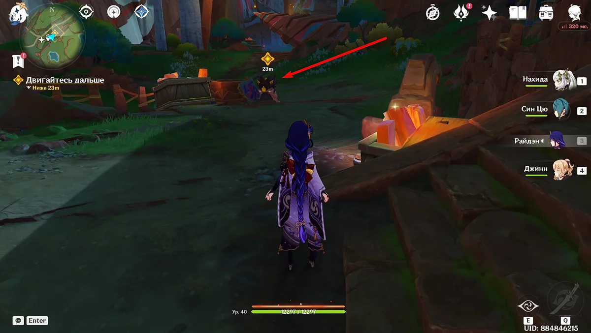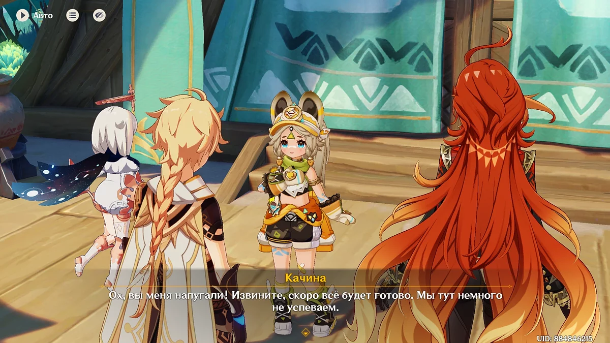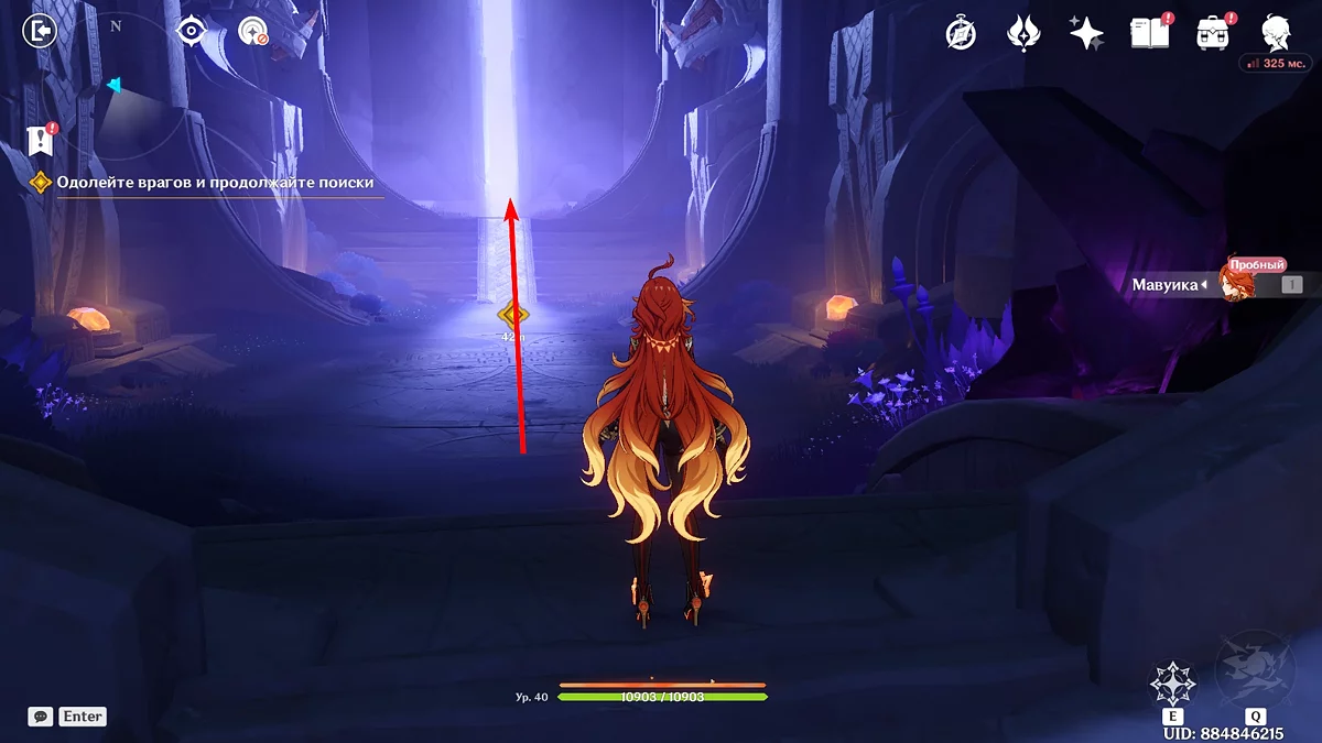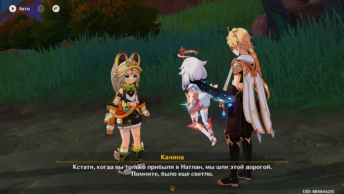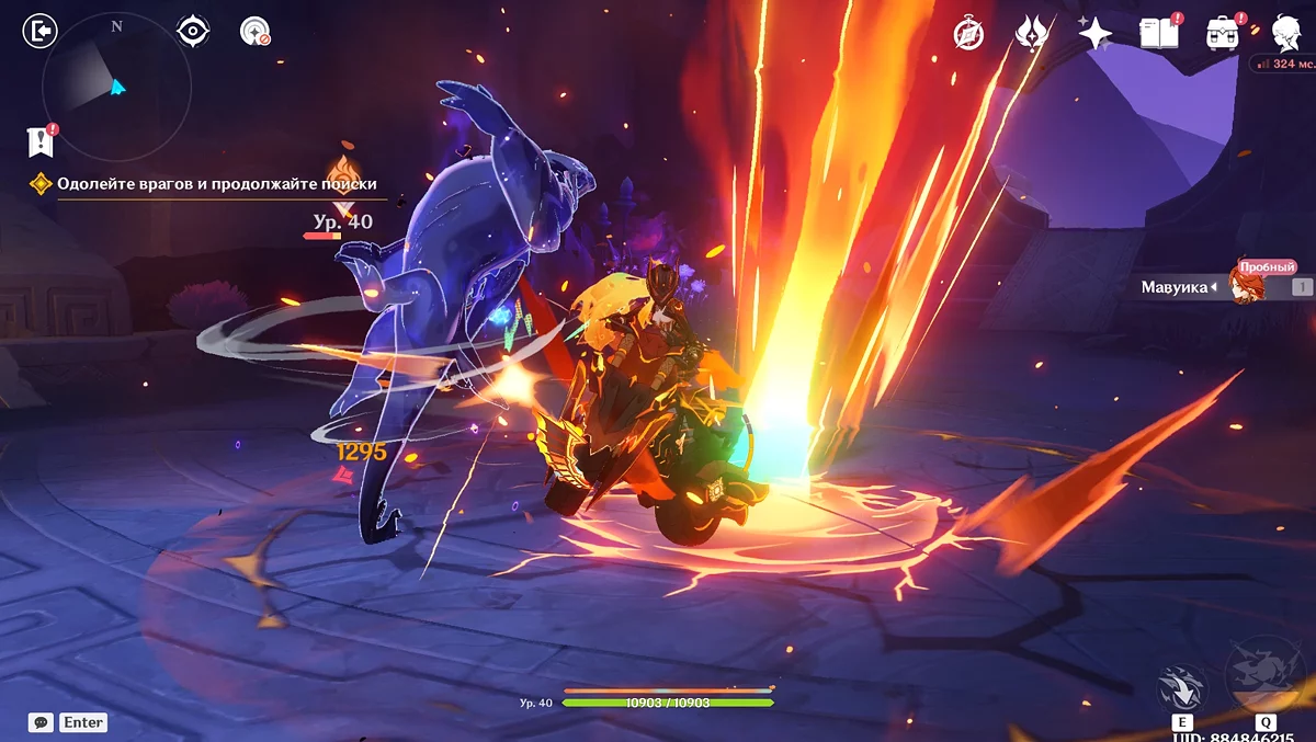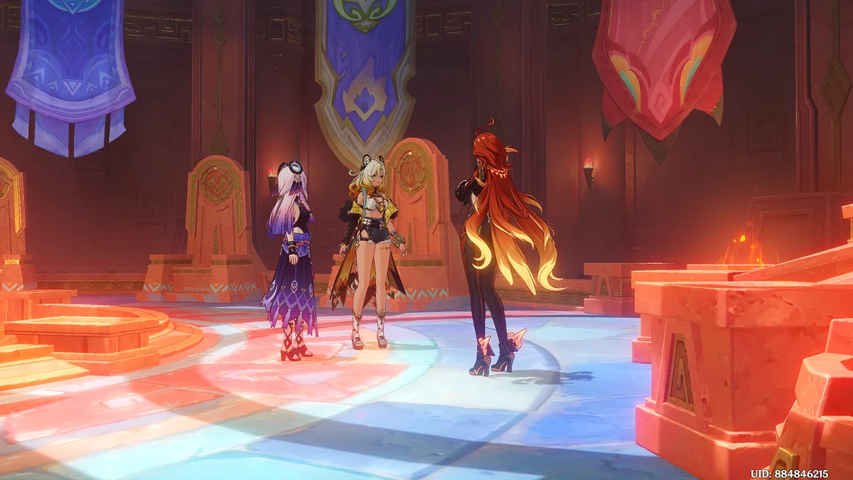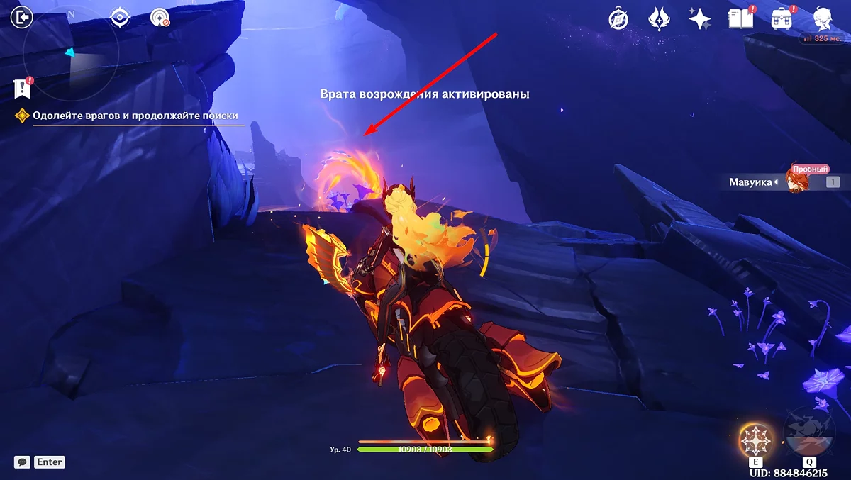 Po przejściu do przodu, aktywna postać zmieni się na Mavuikę. Idź naprzód i pokonaj dwa mimiflory. Użyj umiejętności bohaterki, aby szybciej pokonać wrogów. Idąc dalej, skocz na duchową ścieżkę (wcześniej aktywując cykl płomieni). Pokonaj Cryo Abyss Mage'a i kontynuuj. Mavuika porozmawia ze swoją siostrą Hini i ruszy dalej. Następnie akcja przełączy się na Podróżnika.