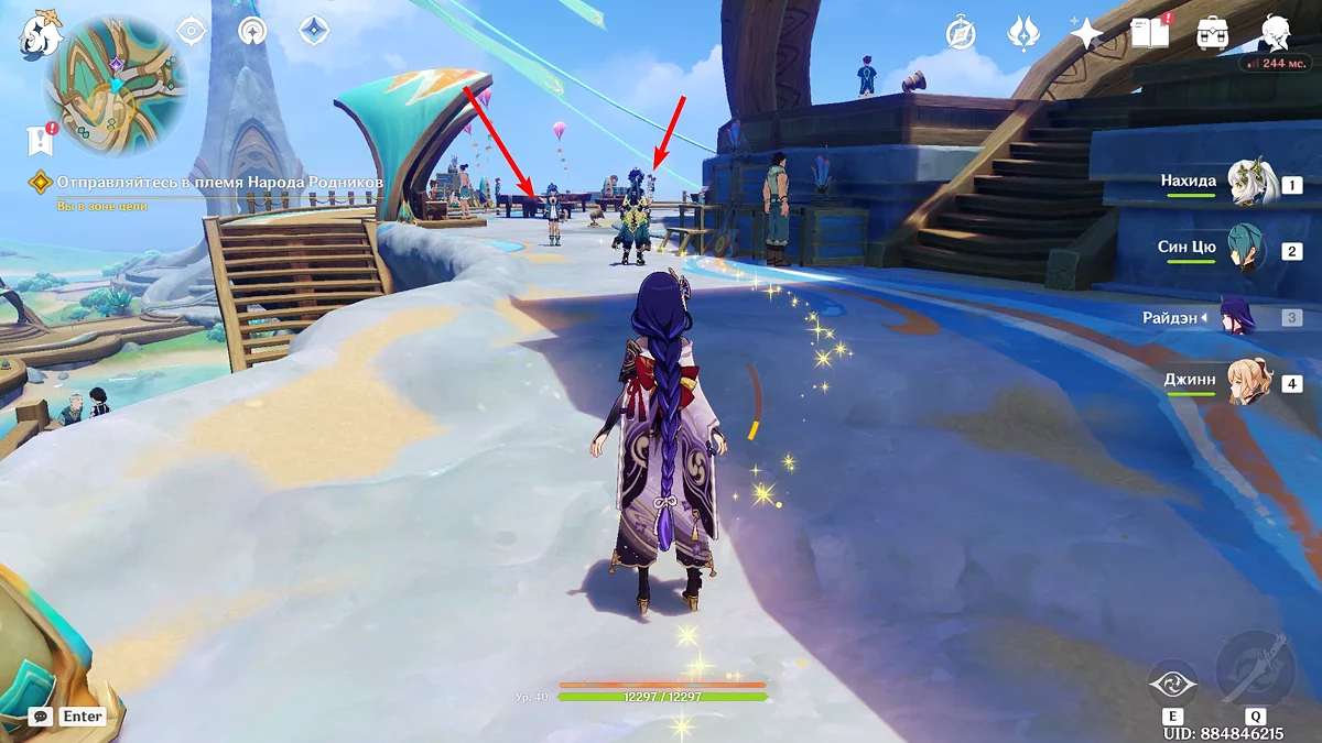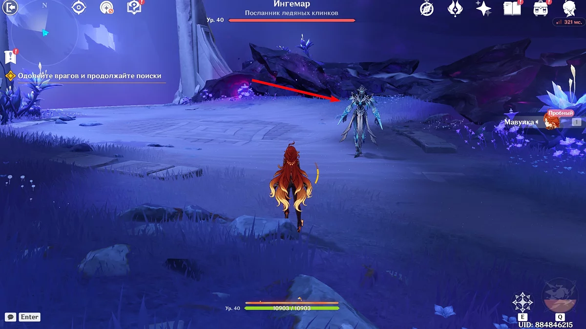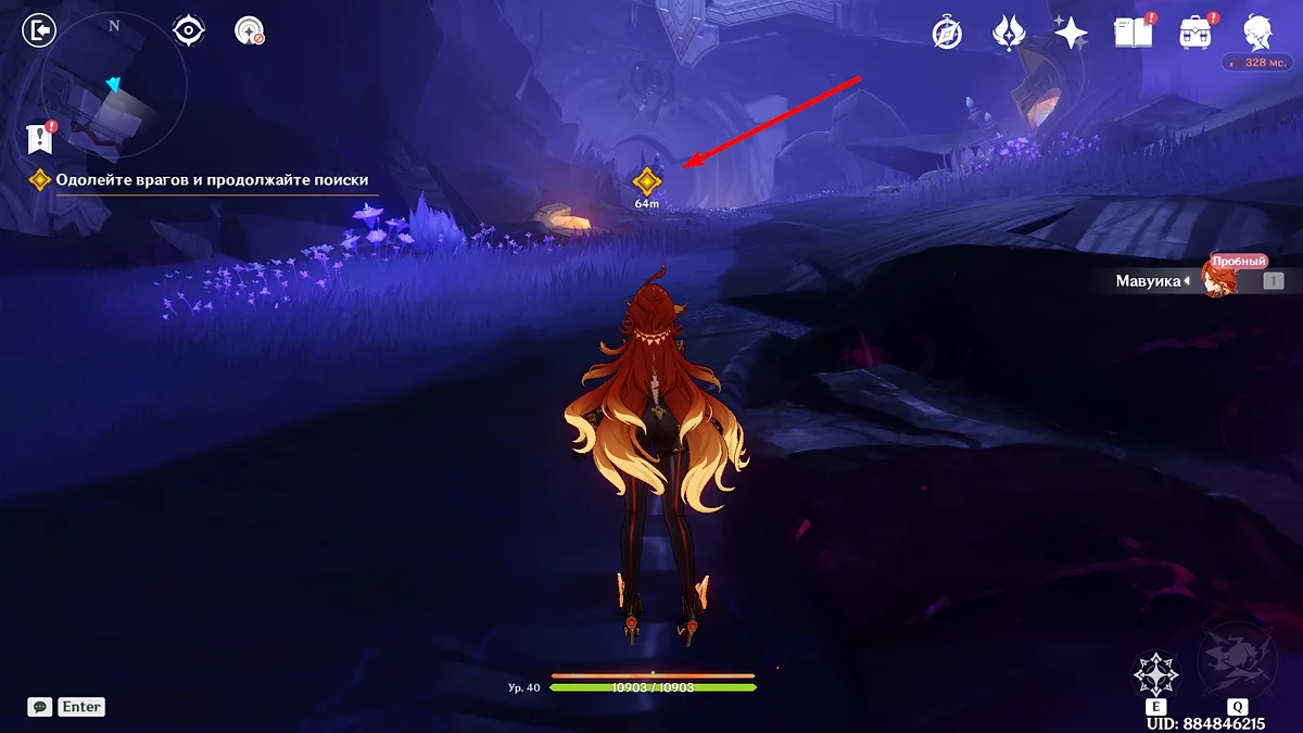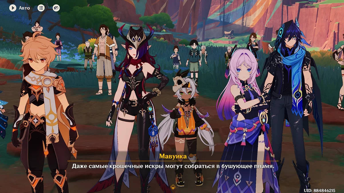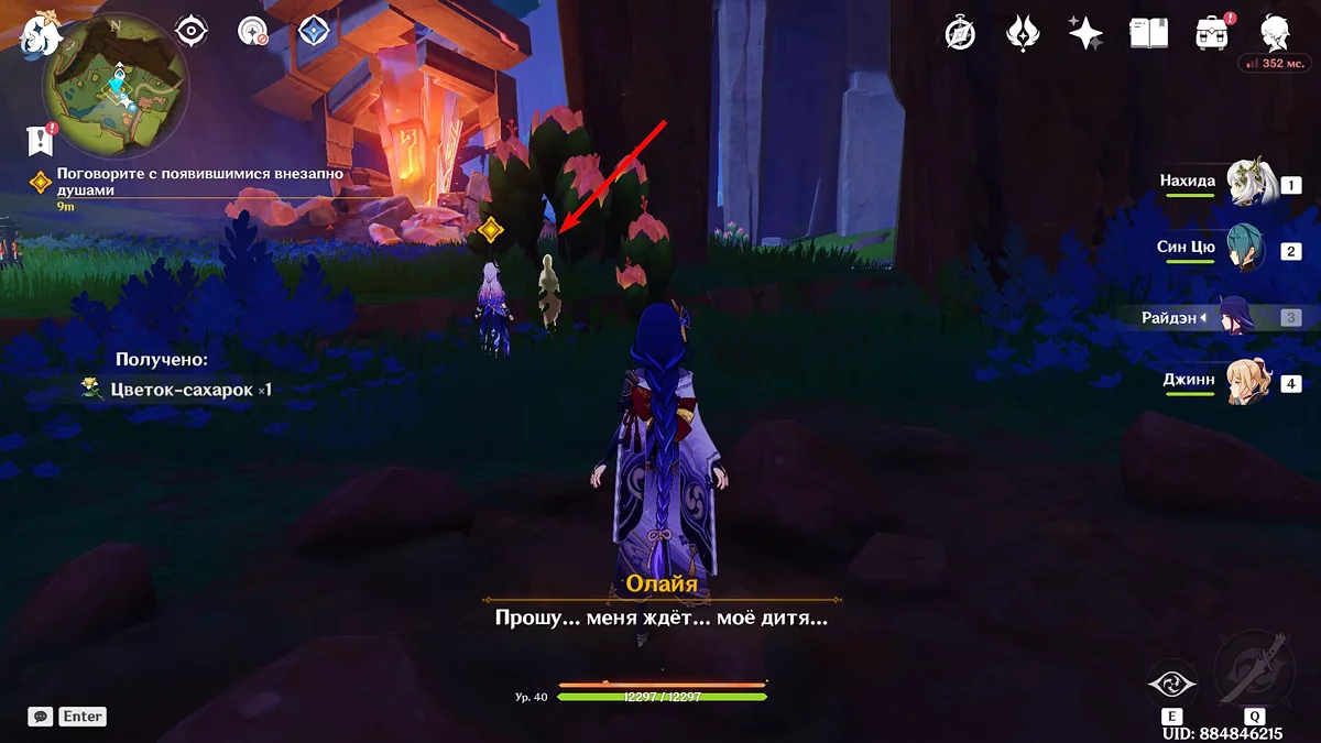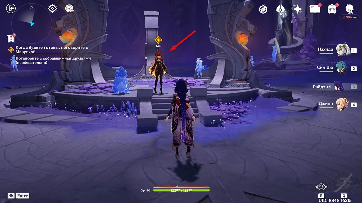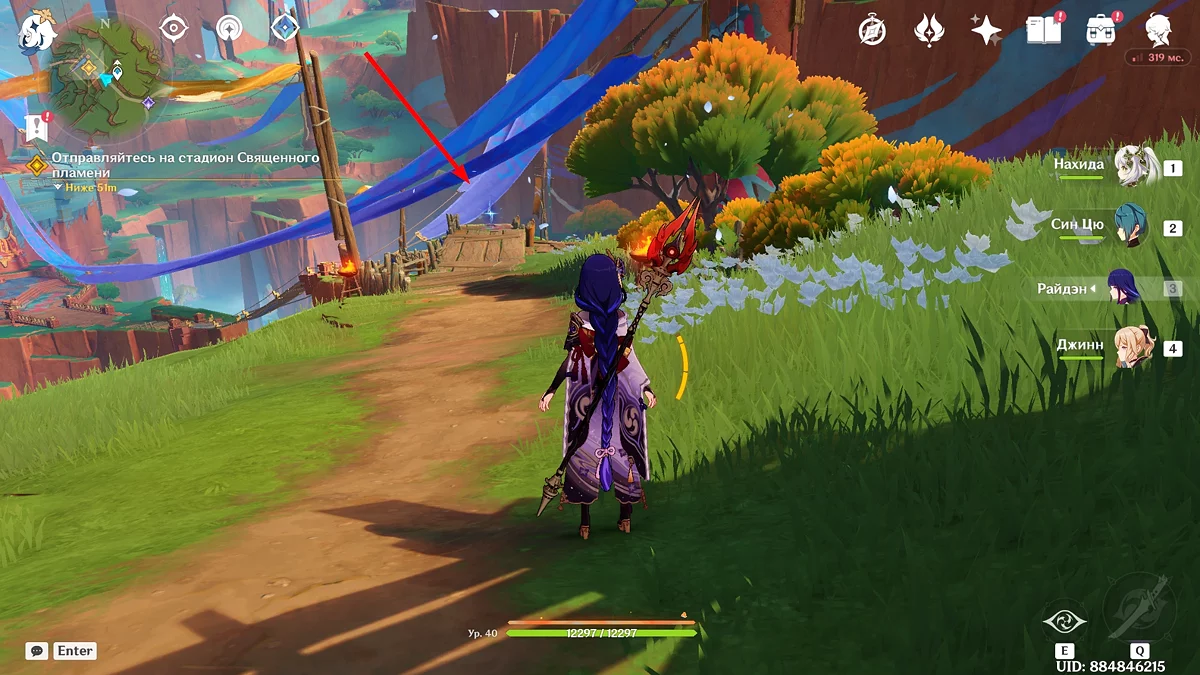 Po przejściu do przodu, aktywna postać zmieni się na Mavuikę. Idź naprzód i pokonaj dwa mimiflory. Użyj umiejętności bohaterki, aby szybciej pokonać wrogów. Idąc dalej, skocz na duchową ścieżkę (wcześniej aktywując cykl płomieni). Pokonaj Cryo Abyss Mage'a i kontynuuj. Mavuika porozmawia ze swoją siostrą Hini i ruszy dalej. Następnie akcja przełączy się na Podróżnika.