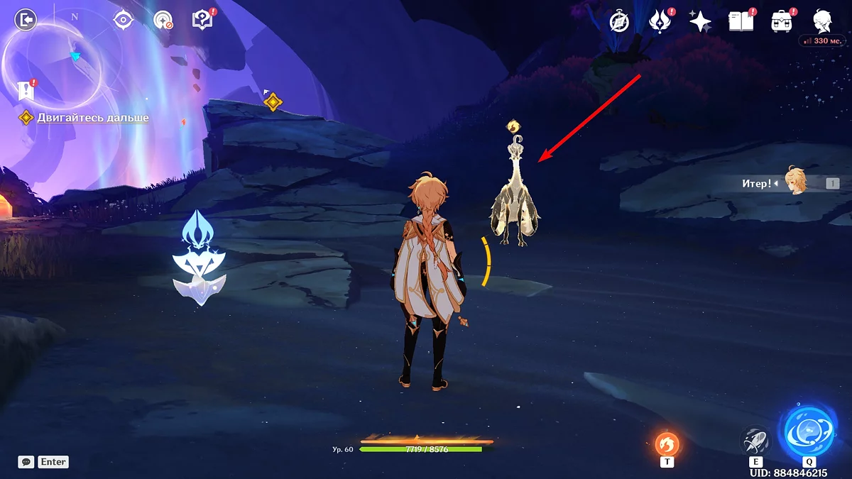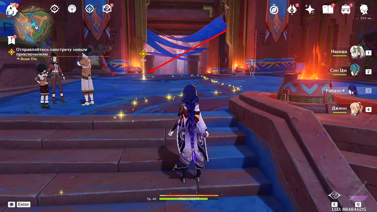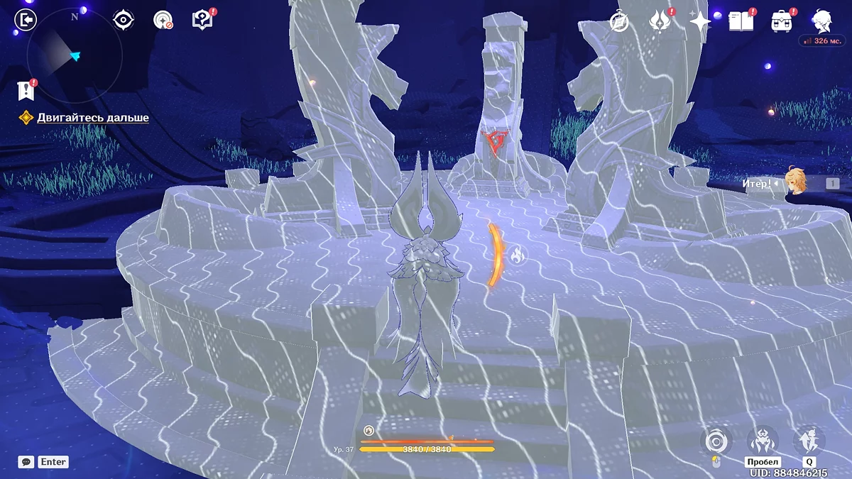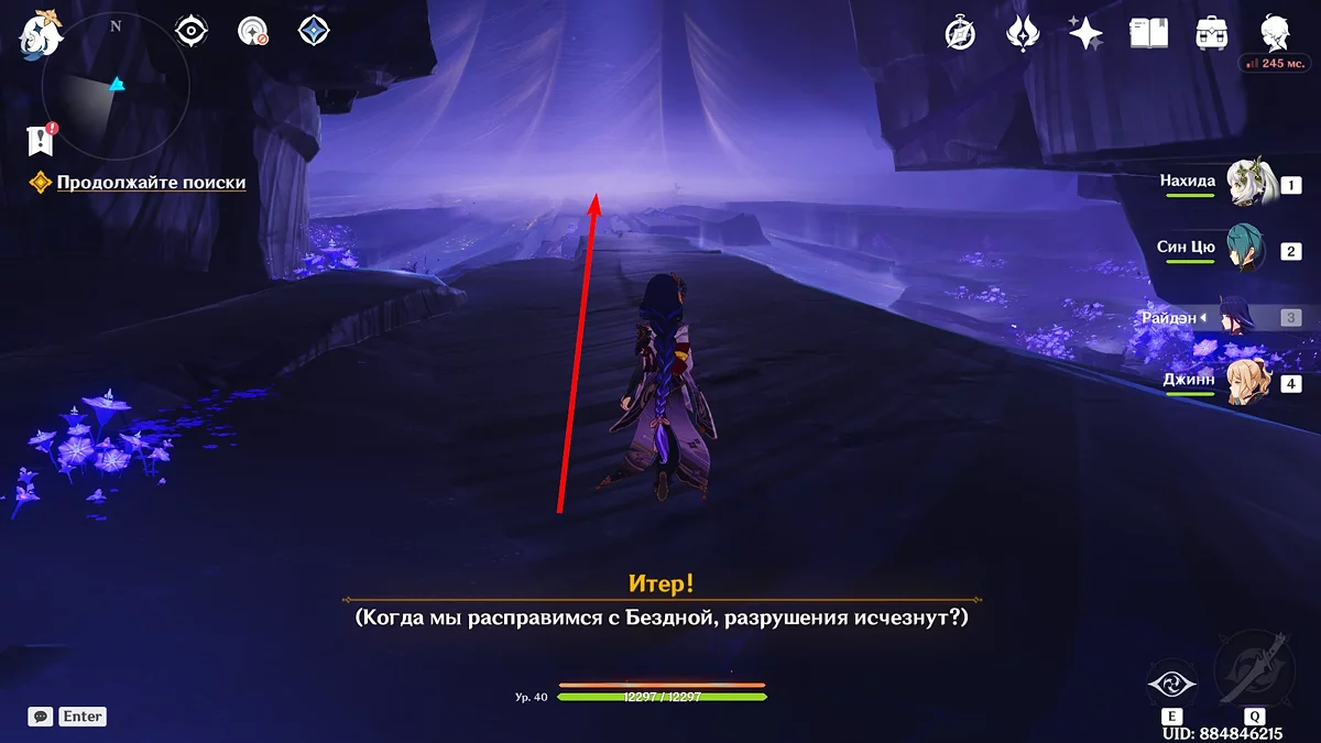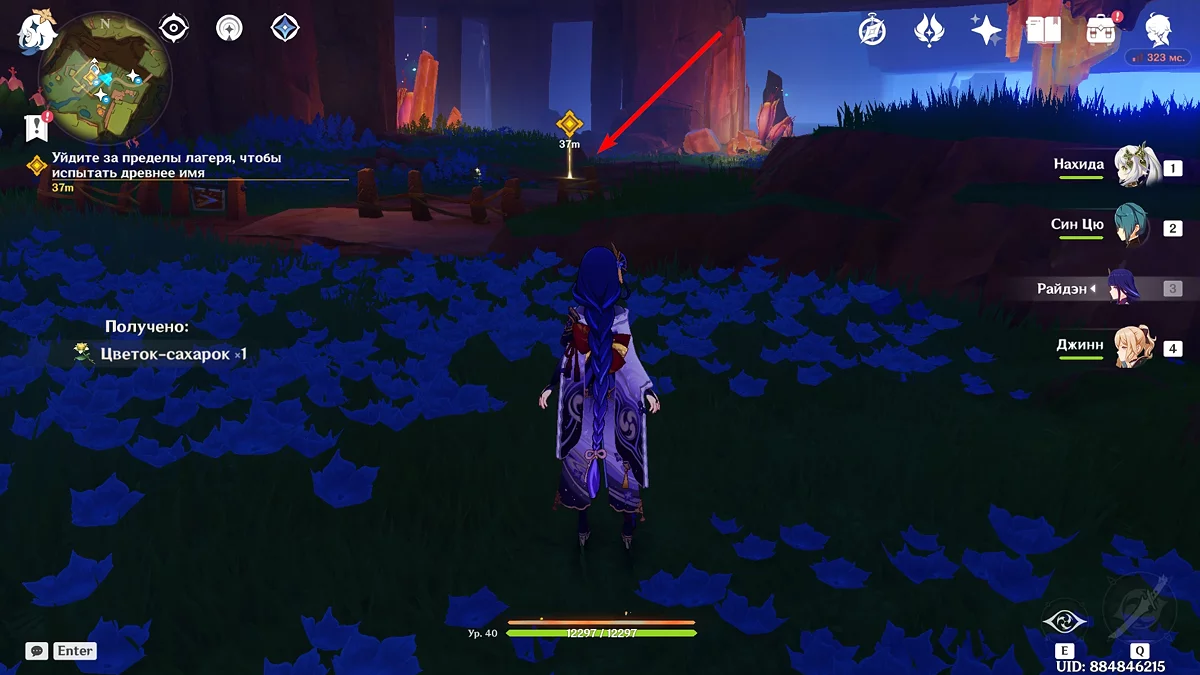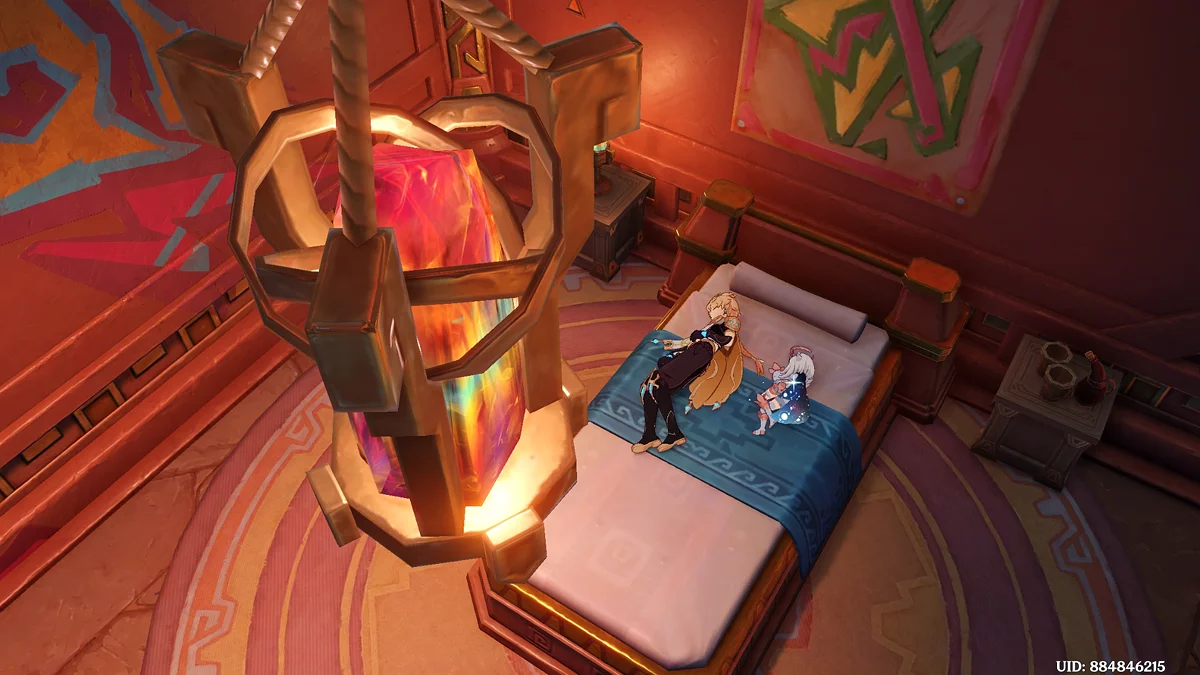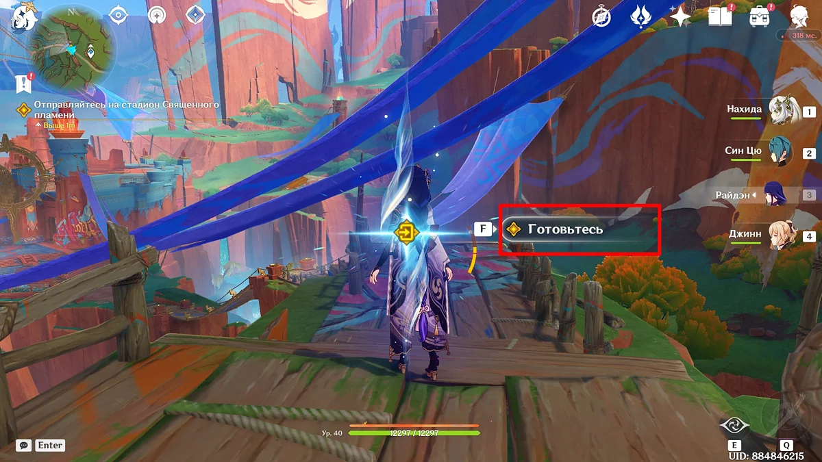 Po przejściu do przodu, aktywna postać zmieni się na Mavuikę. Idź naprzód i pokonaj dwa mimiflory. Użyj umiejętności bohaterki, aby szybciej pokonać wrogów. Idąc dalej, skocz na duchową ścieżkę (wcześniej aktywując cykl płomieni). Pokonaj Cryo Abyss Mage'a i kontynuuj. Mavuika porozmawia ze swoją siostrą Hini i ruszy dalej. Następnie akcja przełączy się na Podróżnika.