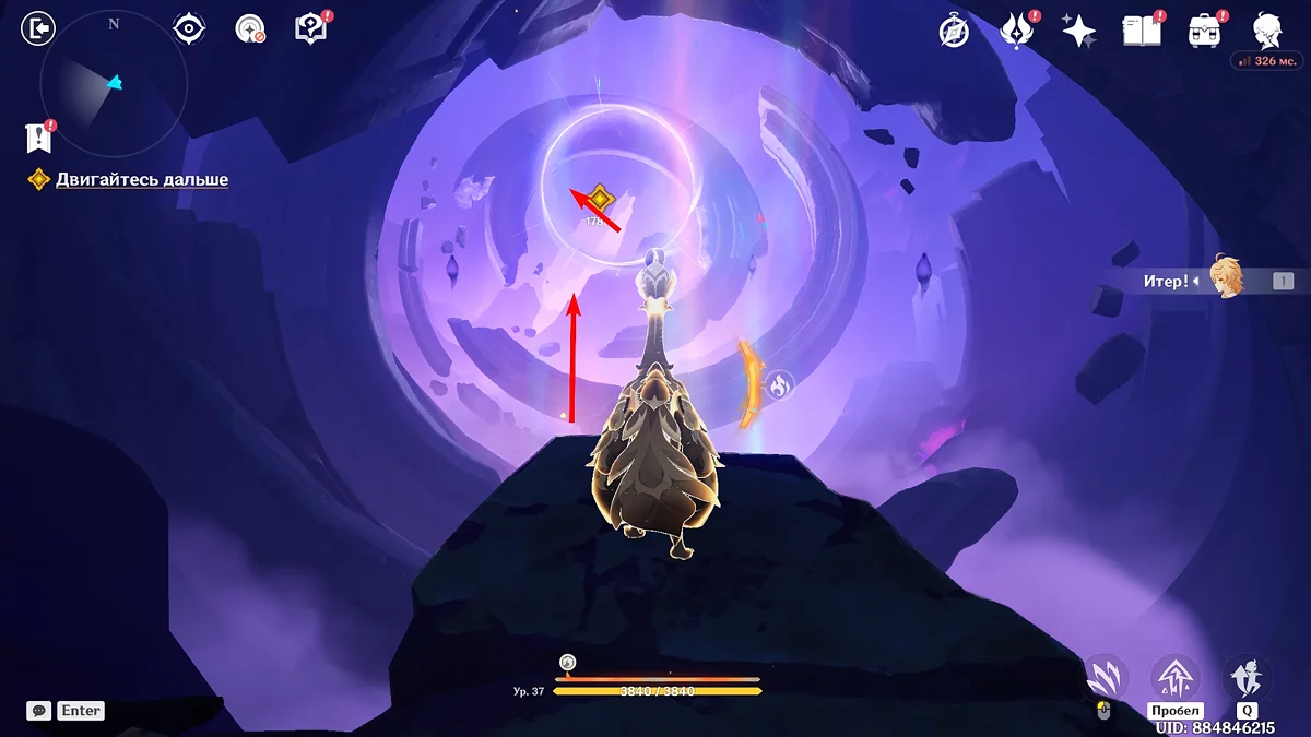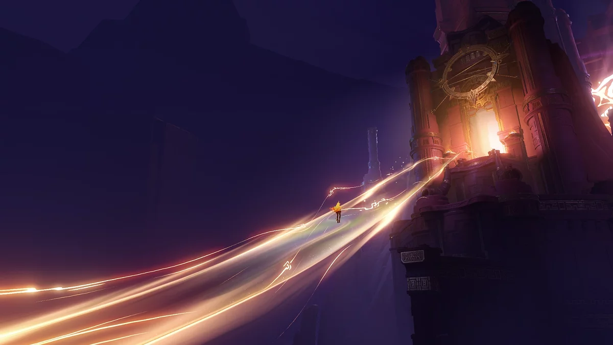 Posiądź kukuzawra i, wznosząc się na strumieniu flogistonu, leć naprzód przez pierścienie. Unikając ataków Otchłani, znajdziesz się przed kolejnym zestawem bram. Aktywuj przełącznik i wejdź do środka.