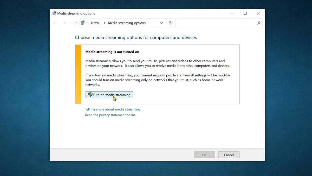 Przez wyszukiwanie na laptopie otwórz Centrum sieci i udostępniania, gdzie w menu po lewej stronie przejdź do opcji przesyłania mediów. Przy pierwszym otwarciu włącz niezbędną usługę i zaznacz pola obok nazwy każdego z naszych urządzeń. Nie zapomnij wcześniej przełączyć wskaźnika, aby wyświetlał tylko urządzenia w lokalnej sieci.