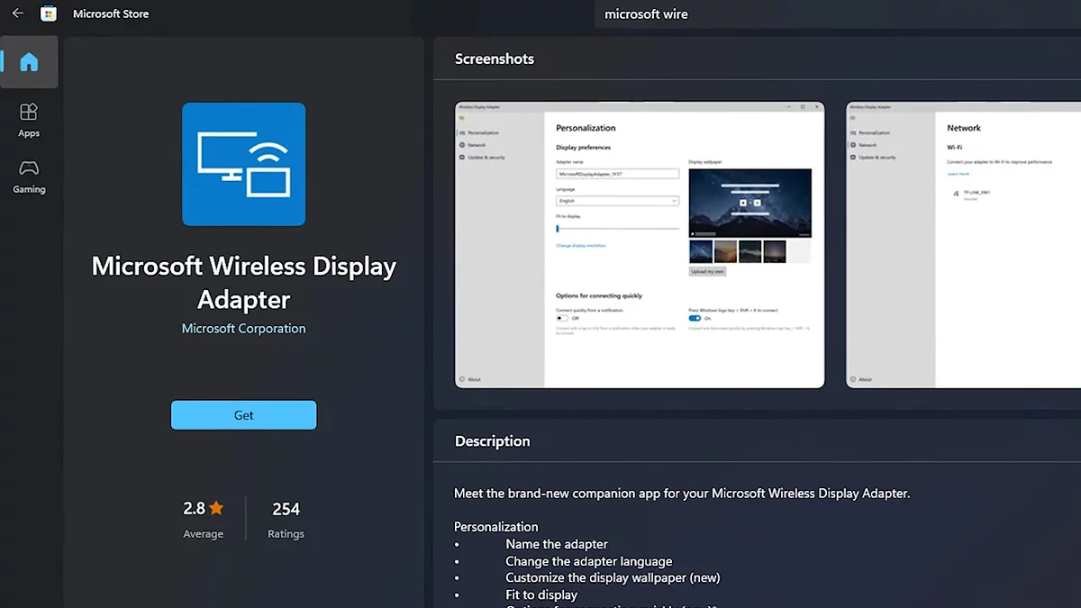 Protokoły do przesyłania informacji podobne do AirPlay. Przed rozpoczęciem otwórz Microsoft Store i zainstaluj najnowszą wersję sterowników Microsoft Wireless Display Adapter. Jednocześnie, jeśli usługa Miracast jest niedostępna, pobierzesz ją również.