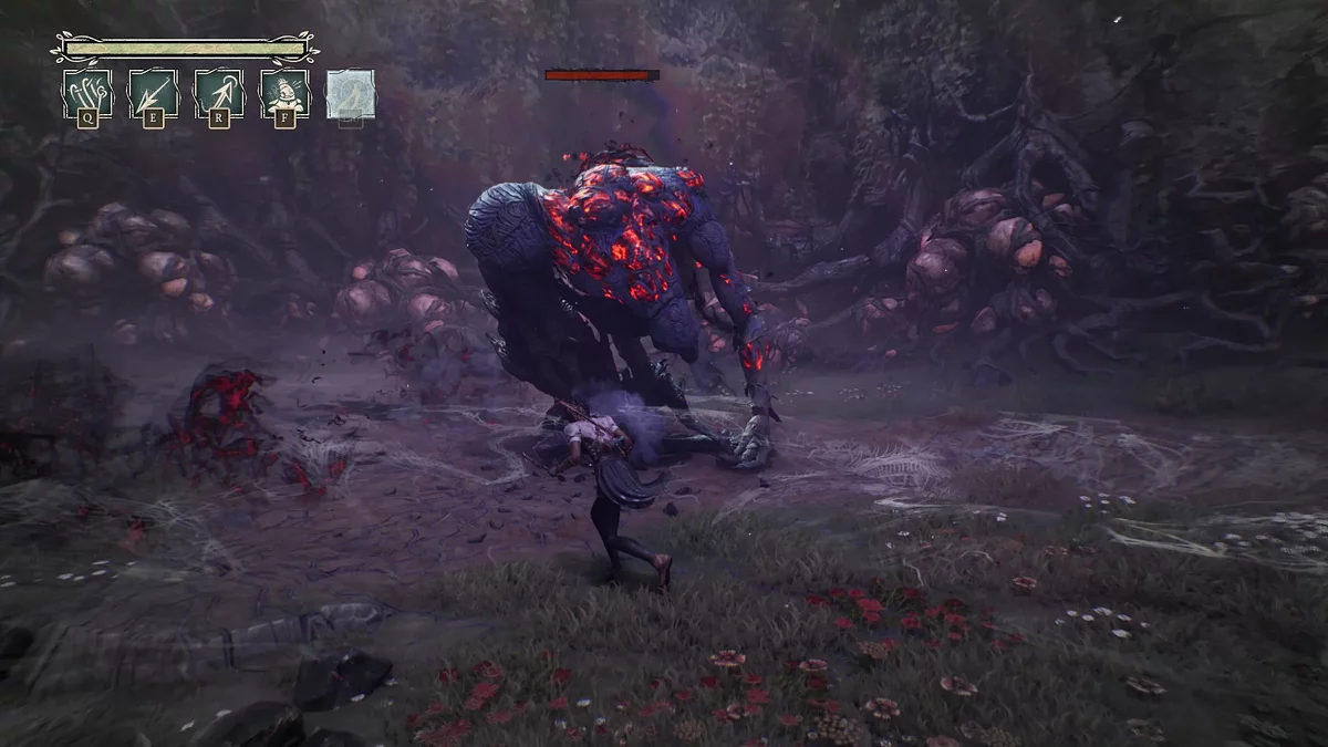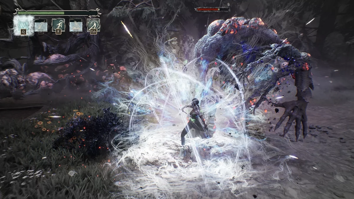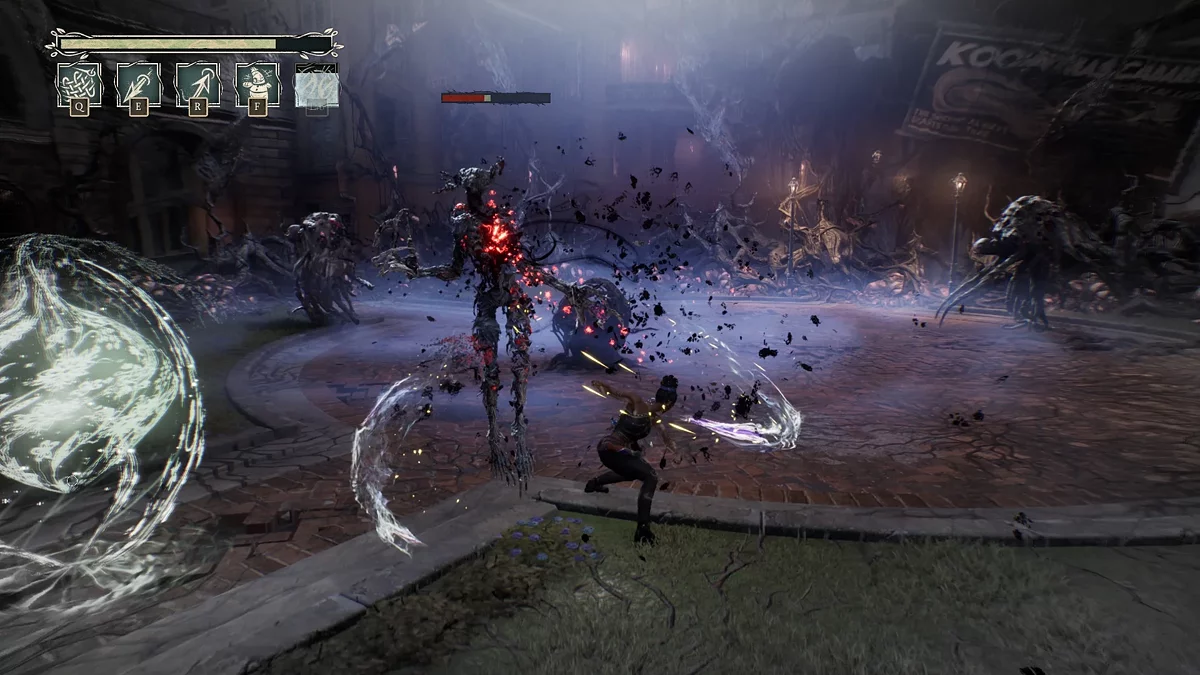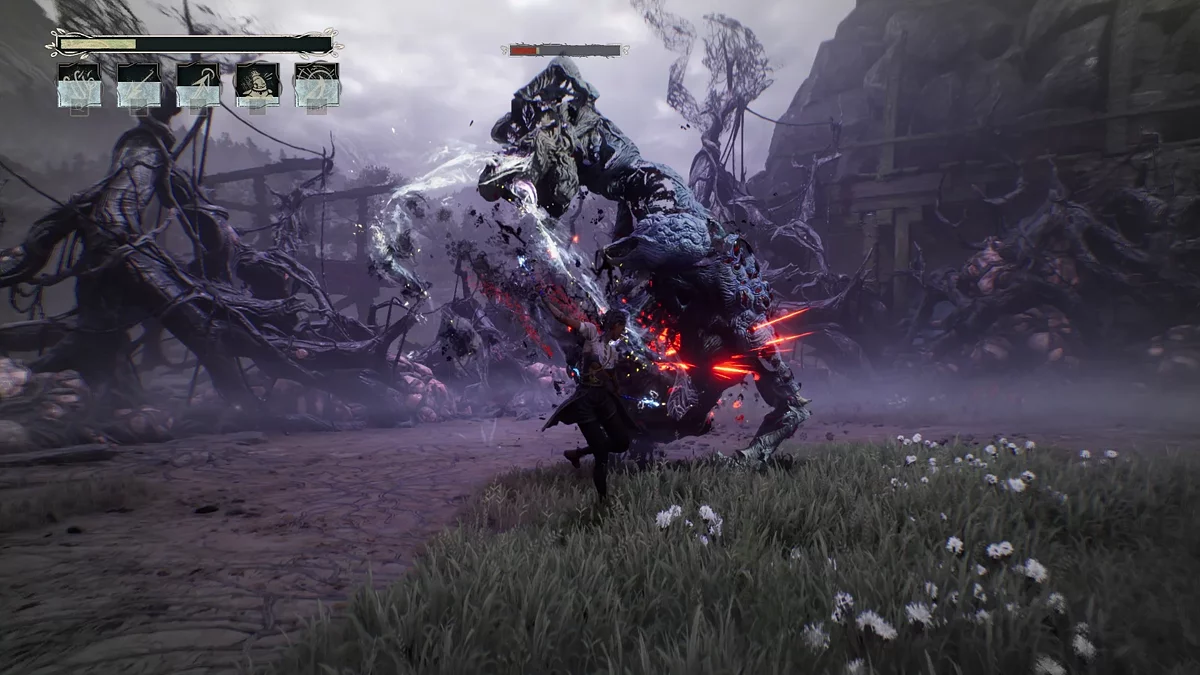 Gra oferuje kilka walk z bossami, które znacząco różnią się od standardowych aren walki. Na przykład, konfrontacja z aligatorem wymaga precyzyjnych uników przed atakami i terminowego użycia dzwonka, aby tymczasowo ogłuszyć wroga. Walka z Loup-Garou odbywa się w najlepszych tradycjach FromSoftware — wymaga precyzyjnych uników i reakcji na niespodziewane ataki. Chociaż zachowanie bossów opiera się na przewidywalnych wzorcach, co zmniejsza ogólny poziom trudności, te starcia wprowadzają potrzebną różnorodność do dość monotonnej rozgrywki.