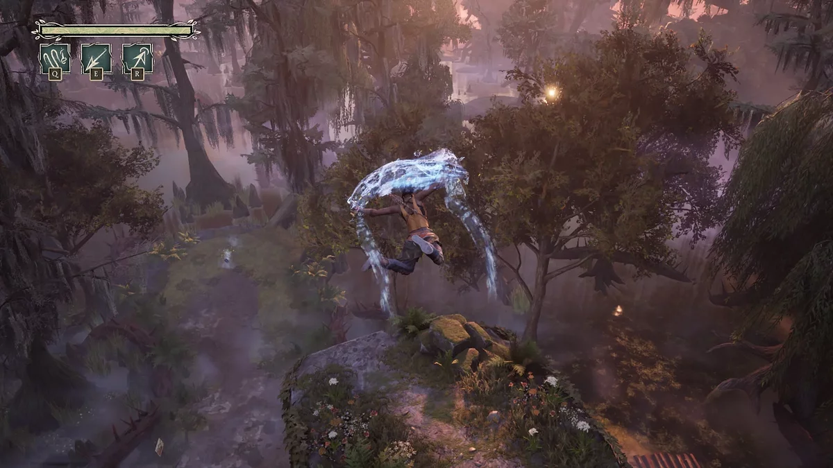 Arsenal Hazel obejmuje różne umiejętności tkackie, które pomagają jej szybko poruszać się po rozległych poziomach. Twórcy wprowadzają je stopniowo, aby zaskoczyć graczy nowymi możliwościami. Na początku nauczysz się podwójnego skoku i ślizgania, jak w The Legend of Zelda: Breath of the Wild, potem biegania po ścianach, jak w Prince of Persia, co ostatecznie pozwala ci chwytać specjalne punkty i ślizgać się w powietrzu, jak w Prototype, i tak dalej. Jednak South of Midnight nie przytłacza graczy skomplikowanymi wyzwaniami platformowymi ani nie zmusza ich do obliczania każdego ruchu.