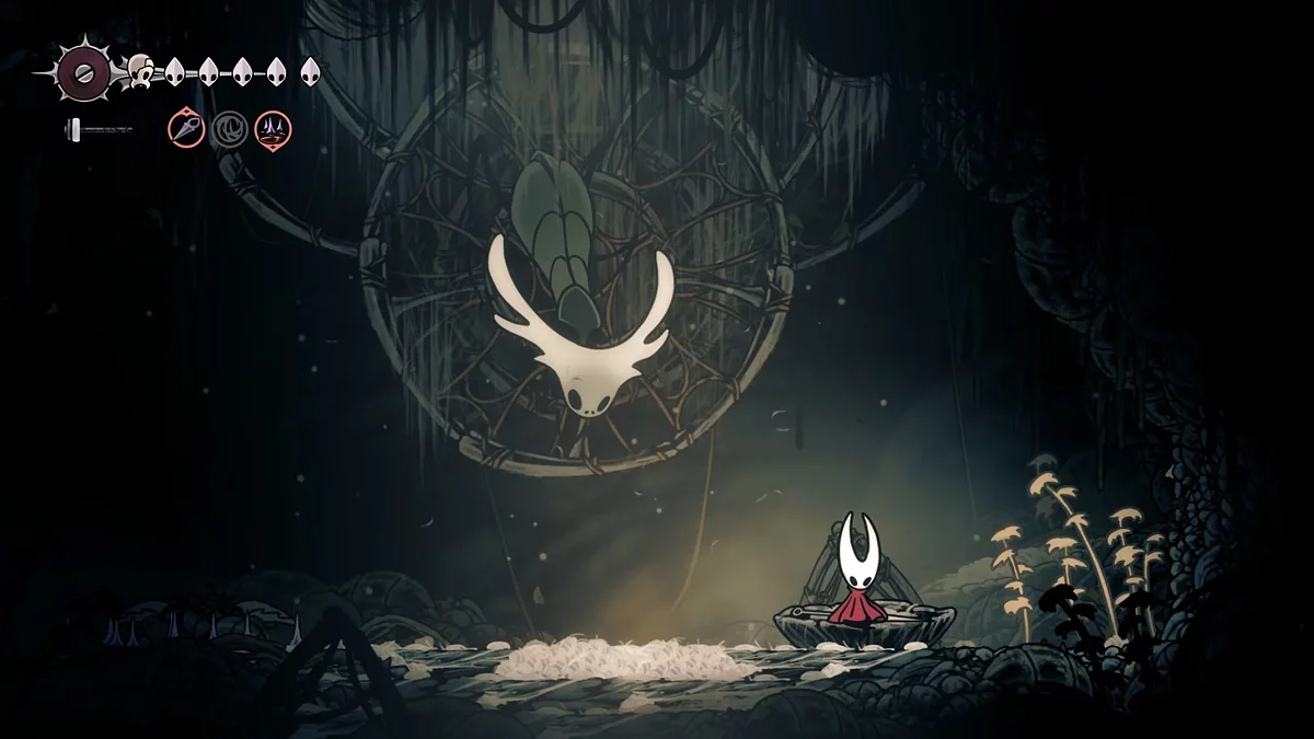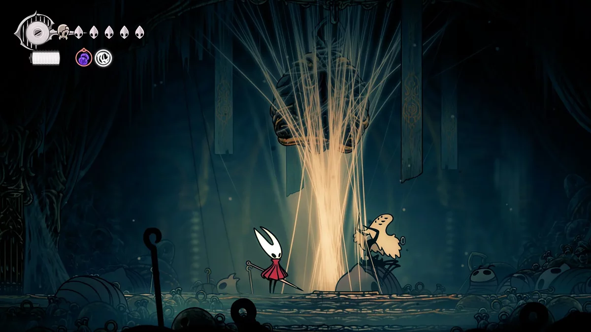 Nawet z narzędziami, walka w Silksong nie jest łatwa. To celowo hardcore'owa gra: jej próby podkreślają centralny temat fabuły. Postacie nieustannie przypominają ci, jak niebezpieczna jest pielgrzymka na powierzchnię, a ty odczuwasz to niebezpieczeństwo na własnej skórze.