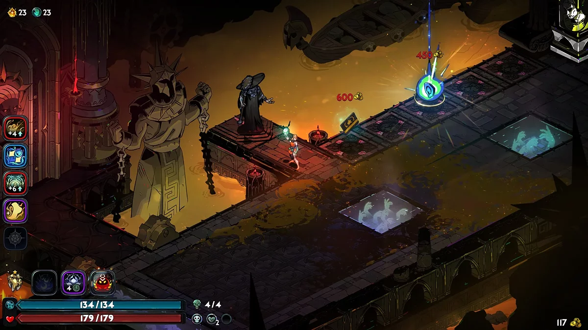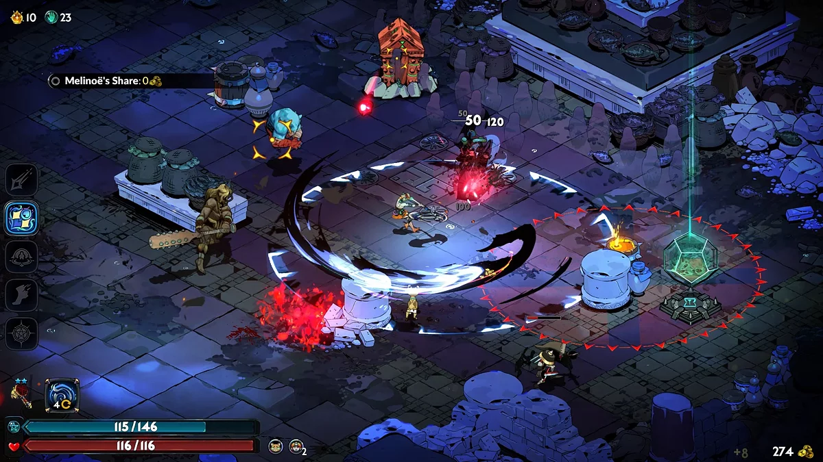 Dash Melinoë ma niewielkie opóźnienie, ale ma także sprint — niezwykle przydatną umiejętność do lepszego pozycjonowania podczas walk. Wiele jej broni ma opcje zasięgowe, a wrogowie często strzelają własnymi pociskami, więc aby uniknąć stania się łatwym celem, musisz mądrze poruszać się po arenie. Oryginalna gra często sprowadzała się do chaotycznego unikania i spamowania atakami.