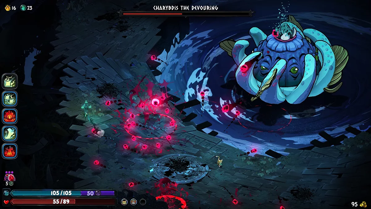 Na koniec system boskich darów został przeprojektowany, aby zachęcać graczy do korzystania z całego zestawu ruchów Melinoë: jej podstawowego ataku, specjalnego, zaklęcia wiążącego i wzmocnionych wariantów zasilanych maną. Wszystko to wzmacnia walkę. W pierwszej grze możliwe było zbudowanie całej rozgrywki wokół jednego ruchu — na przykład, nakładając buffy na podstawowe ataki. Teraz dary zachęcają do synergii między różnymi umiejętnościami, a wrogowie są zaprojektowani tak, że ignorowanie części swojego zestawu narzędzi nie jest opcją. Niektórzy wrogowie zamykają dystans tak szybko, że zaklęcia wiążące stają się niezbędne.