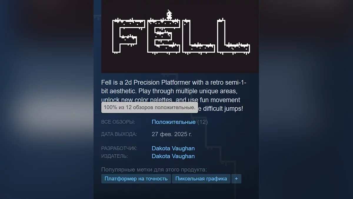 Fell — Prosta platformówka precyzyjna o dziecku, które wpadło do dziury. Gra składa się z 30 krótkich poziomów. Ma 100% pozytywnych recenzji. Strona Steam.