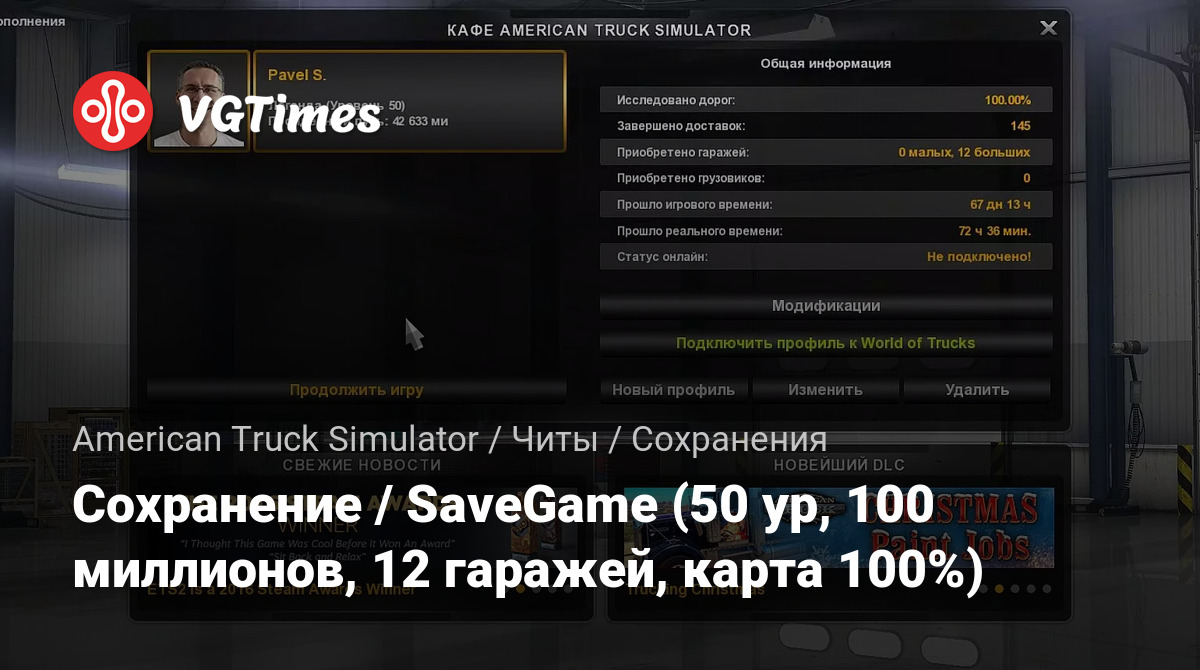 Gry American Truck Simulator Pliki Zapisane Сохранение / SaveGame (50 ур, 100 миллионов, 12 гаражей, карта 100%)