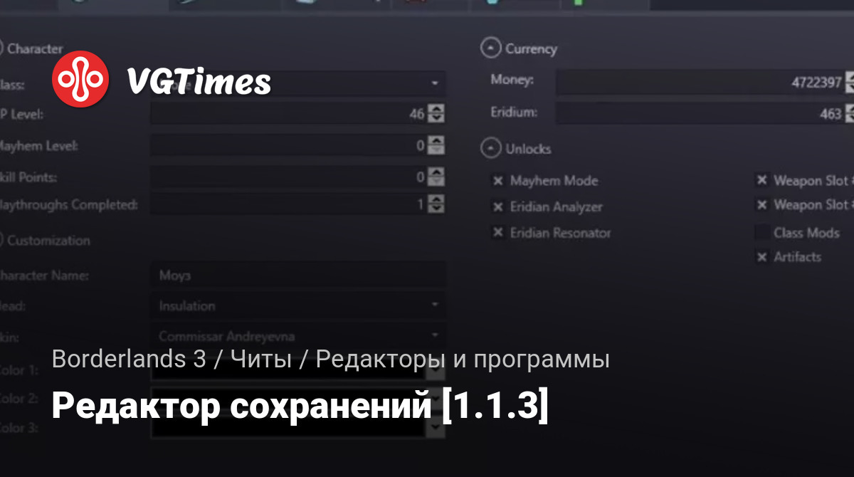 Программа для редактирования файла сохранения персонажа. Позволяет изменять различные параметры персонажа.