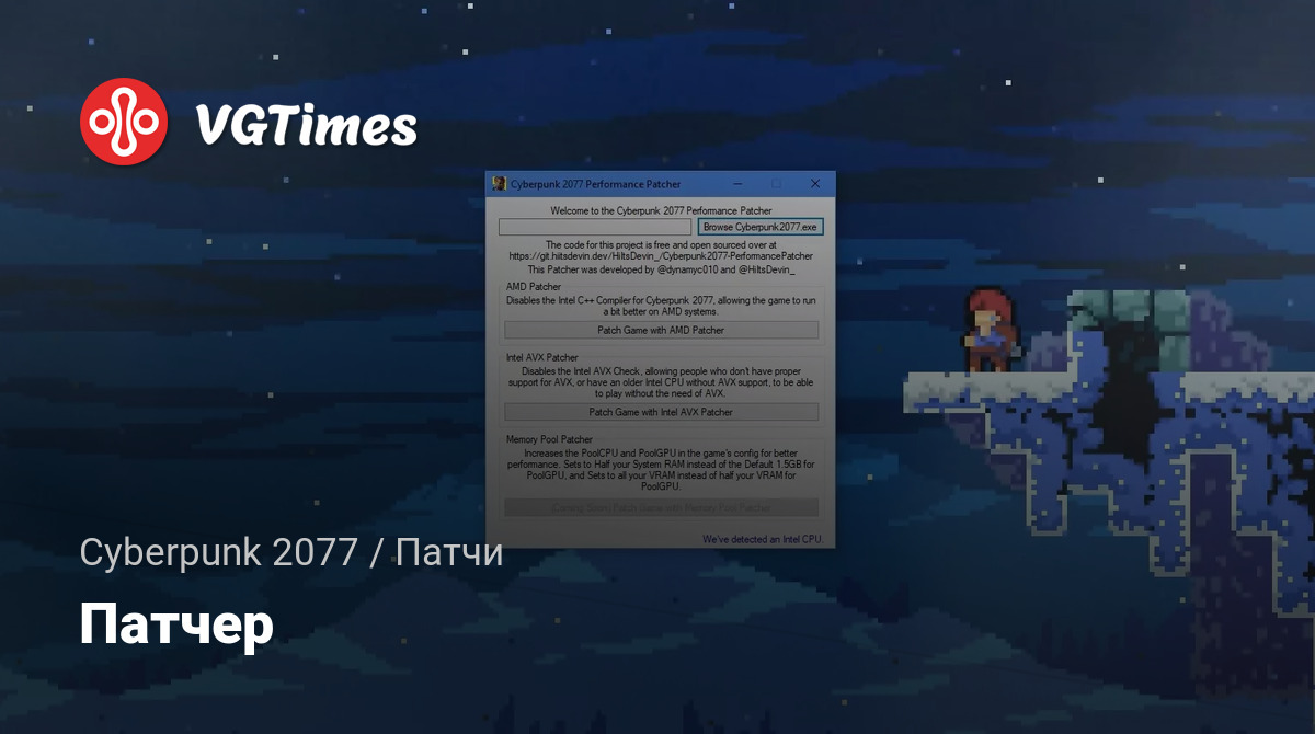 Универсальный инструмент с открытым исходным кодом для Cyberpunk 2077, который отключает Intel AVX, отключает компилятор Intel C ++ для систем AMD. Подойдет, если вы используете патч 1.04.