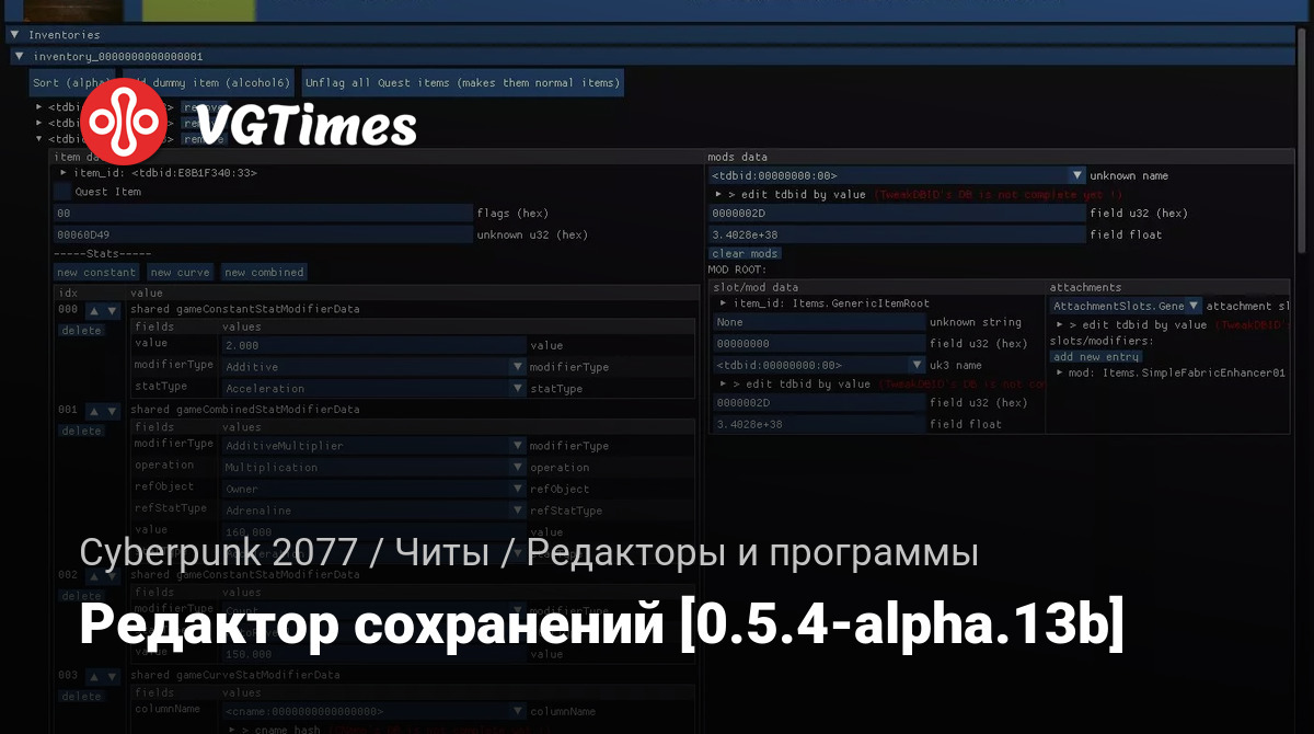 Инструмент для редактирования файлов Cyberpunk 2077 sav.dat.
