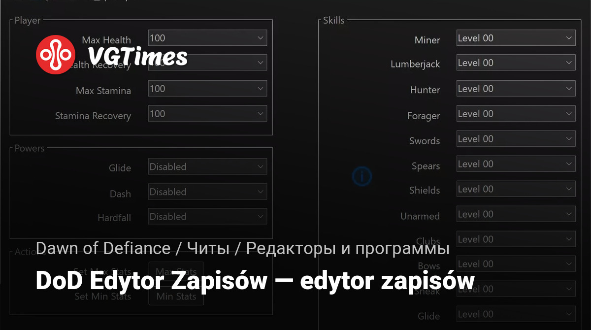 Редактор сохранений для компьютерной видеоигры Dawn of Defiance (Steam/Epic). Позволяет настраивать здоровье, выносливость, способности и навыки персонажа.