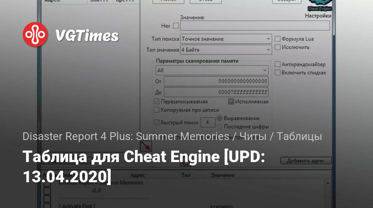• Disaster Report 4 Plus: Summer Memories — Таблица для Cheat Engine [UPD: 13.04.2020]