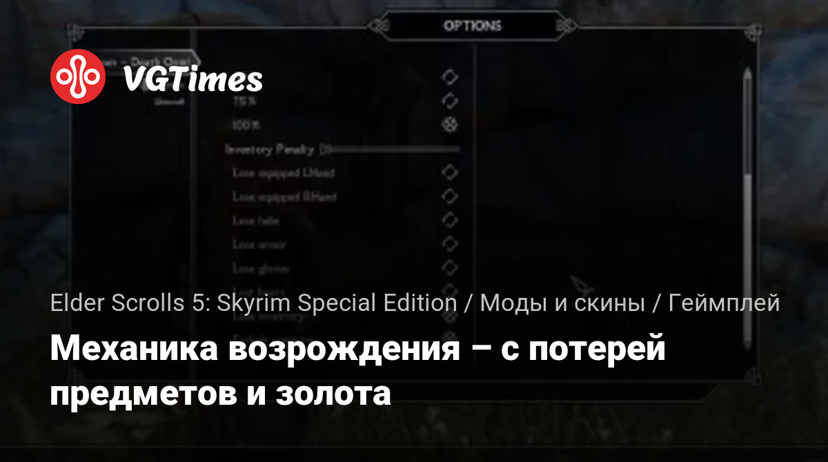 Мод делает смерть частью геймплея – теперь игрок может возрождаться (по выбору – у себя дома, в Зале Мёртвых или Храме Кинарет) с потерей вещей (количество предметов и золота настраивается).