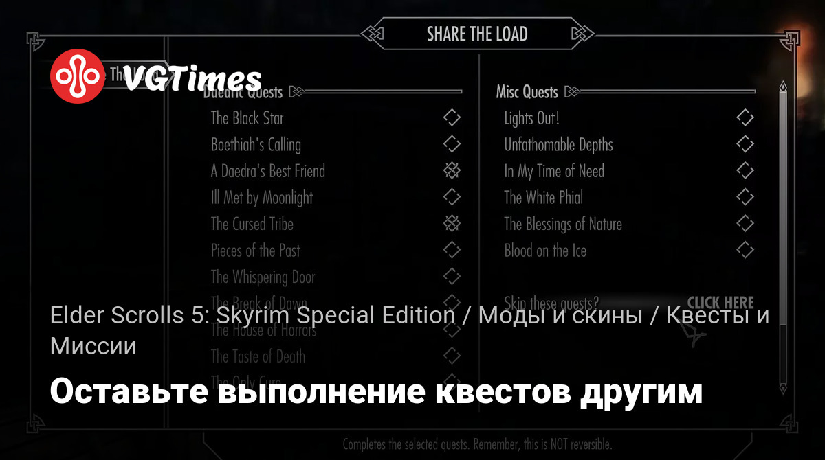 Этот мод меняет все, позволяя некоторым другим авантюристам — неизвестным и невидимым вами — делать что-то полезное для разнообразия. Выберите квесты, которые вы еще не начали, в меню MCM, прежде чем вы сможете сказать "это удобно!" — все они будут выполнены, проблемы решены, квестодатели будут довольны, без вашего участия. Триггеры для заданий никогда не будут вас беспокоить, и задание никогда не появится в вашем журнале. Позволяя вам сосредоточиться на чем то другом для этого персонажа.