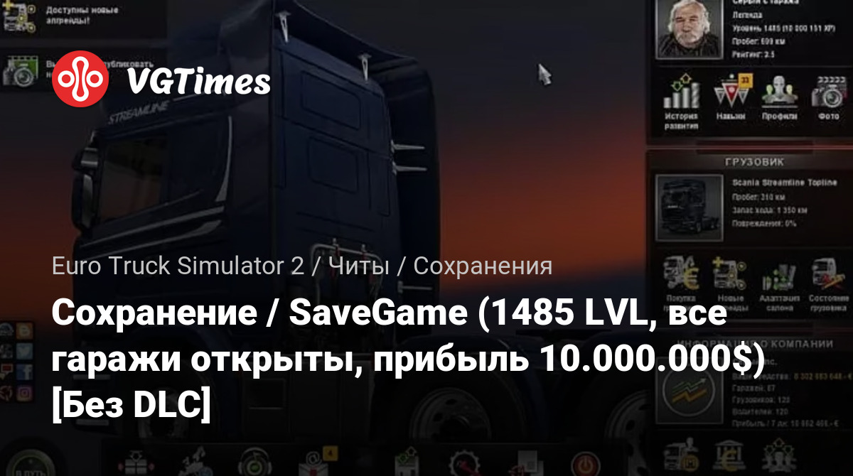 Gry Euro Truck Simulator 2 Pliki Zapisane Сохранение / SaveGame (1485 LVL, все гаражи открыты, прибыль 10.000.000$) [Без DLC]