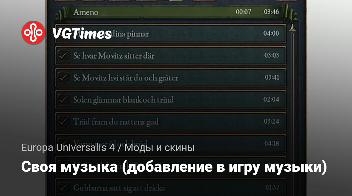 Аналог steam 1) Go to your music folder \Steam\steamapps\common\Europa Universalis IV\music 2) Paste whatever .ogg files you want into it. .wav works as well. mp3 does not. I am unsure what the full list of file extensions that works is. 3) Open songs.txt 4) Take a look at how the code looks for the files already in there. If you don't want to do anything fancy, copy paste the existing code for one of the songs, eg song = { name = "dehominisdignitate.ogg"