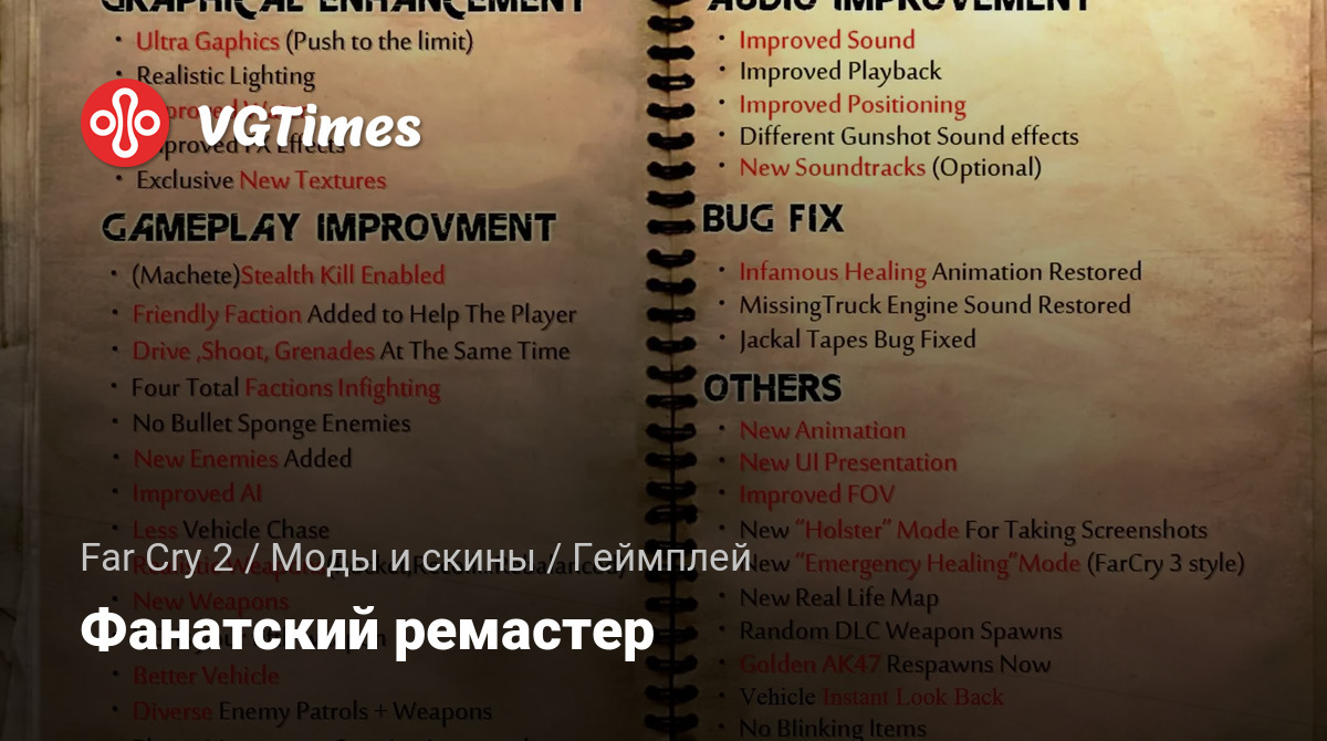 Модификация для шутера Far Cry 2, которую можно назвать полноценным ремастером оригинальной игры. По словам автора мод он не только улучшил графику в игру, но и также исправил некоторые ошибки, улучшил звук и геймплей. Помимо обновленных текстур в игре также появится новая анимация, интерфейс и улучшенный угол обзора.