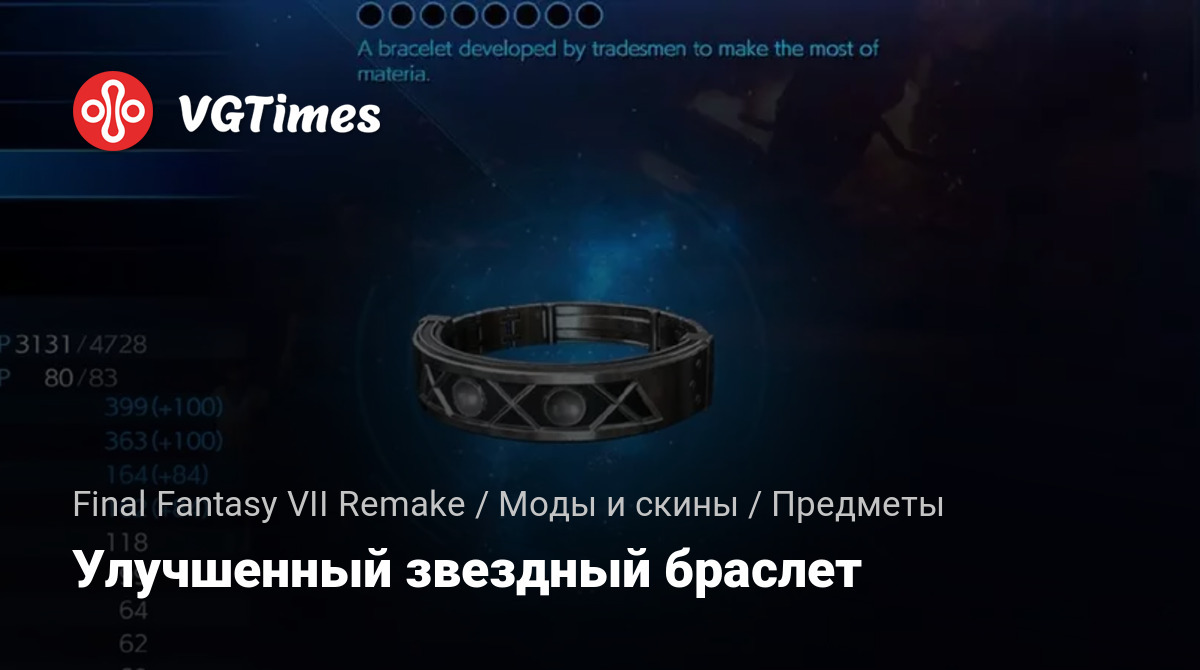 Этот мод дает звездному браслету 8 слотов для материалов и различные повышения характеристик. Есть несколько версий, описания есть под каждым файлом. Для установки перейдите в каталог установки вашей игры, создайте папку с именем ~ mods внутри FFVIIRemakeIntegrade / End / Content / Paks и поместите этот мод внутрь.