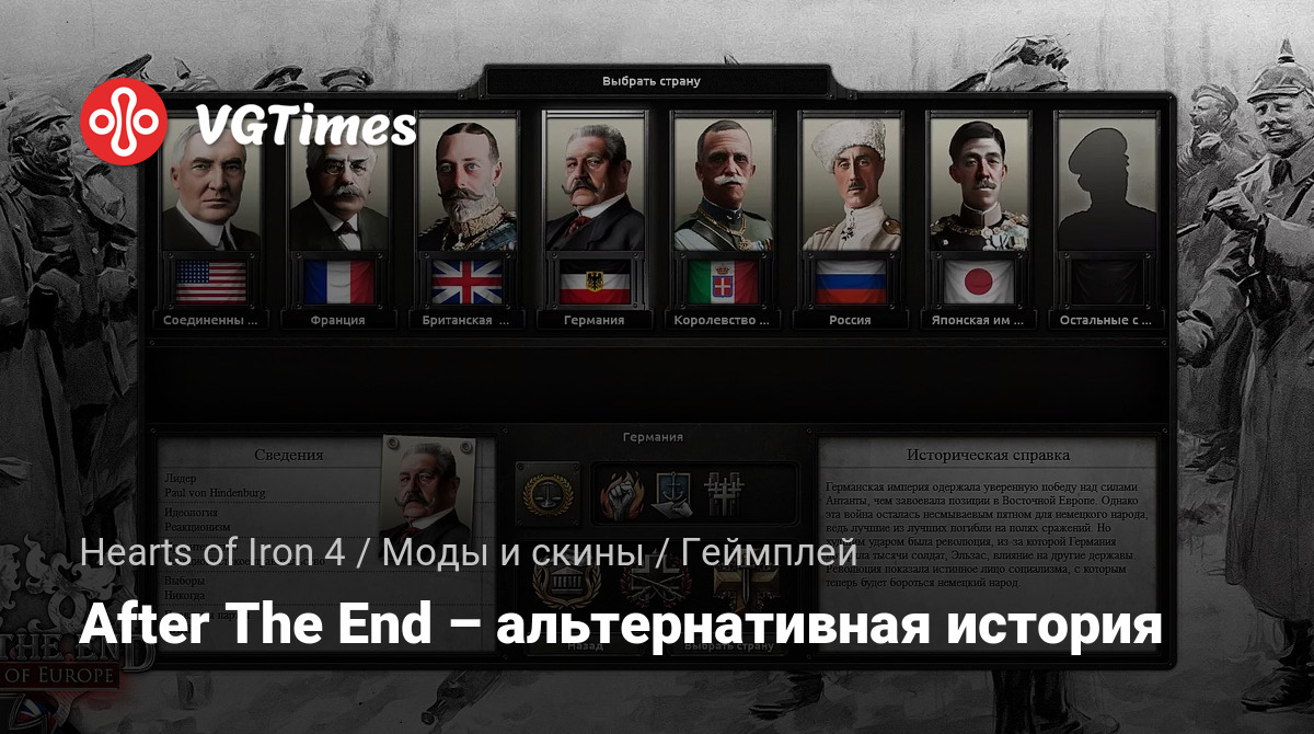 After the end — это мод для игры Hearts of Iron 4, который переносит нас в альтернативный 1922 год. Германия вместо Тройственного союза предпочла альянс с Великобританией, а Россия вместе с Францией образовали свою Антанту. Это привело к Великой войне, в которой участвовали многие державы Европы и Азии. События мода идут через 4 года после окончания Великой войны.