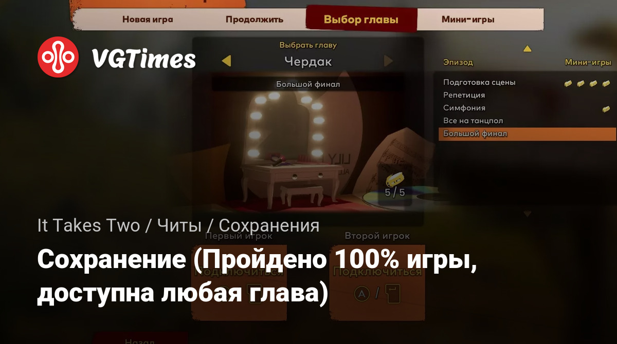 Сохранения «It Takes Two» хранятся в операционной системе Windows в папке [AppData], находящейся по умолчанию в профиле пользователя на системном диске «C». Игра поддерживает облачную синхронизацию сохранений в Steam Cloud.