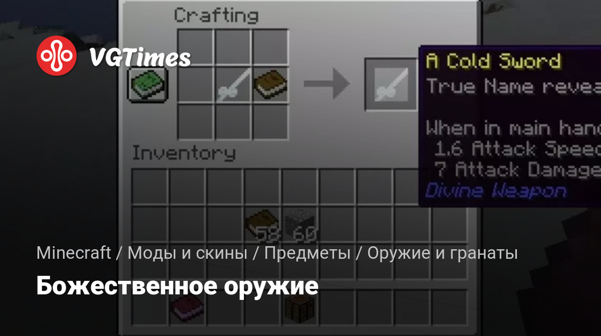 Этот мод добавляет новый набор божественного оружия в вашу игру. Некоторое оружие не для боевого применения, но тем не менее его называют божественным. Сначала, вы копаете землю и находите светящуюся «божественную руду», переплавляете ее в «божественные слитки», затем превращаете в меч. При использовании и улучшении оружие раскроет свое истинное имя и силу.