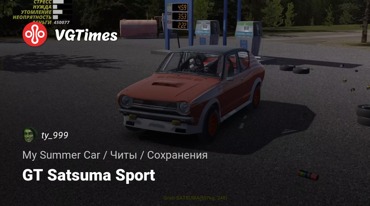 To zapis GT z Satsumą Sport. Pojawisz się w pobliżu kościoła, idź do sklepu Tejmo, a tam będzie twoja Satsuma. Na twoim koncie jest 450077 marek. Satsuma bez numerów, gotowa do rajdów. Na podwórku twojego domu porozrzucane są części. Suczka nie uratowana. Pobierz mod "Rozszerzony sklep Tejmo" przez MSCloader.