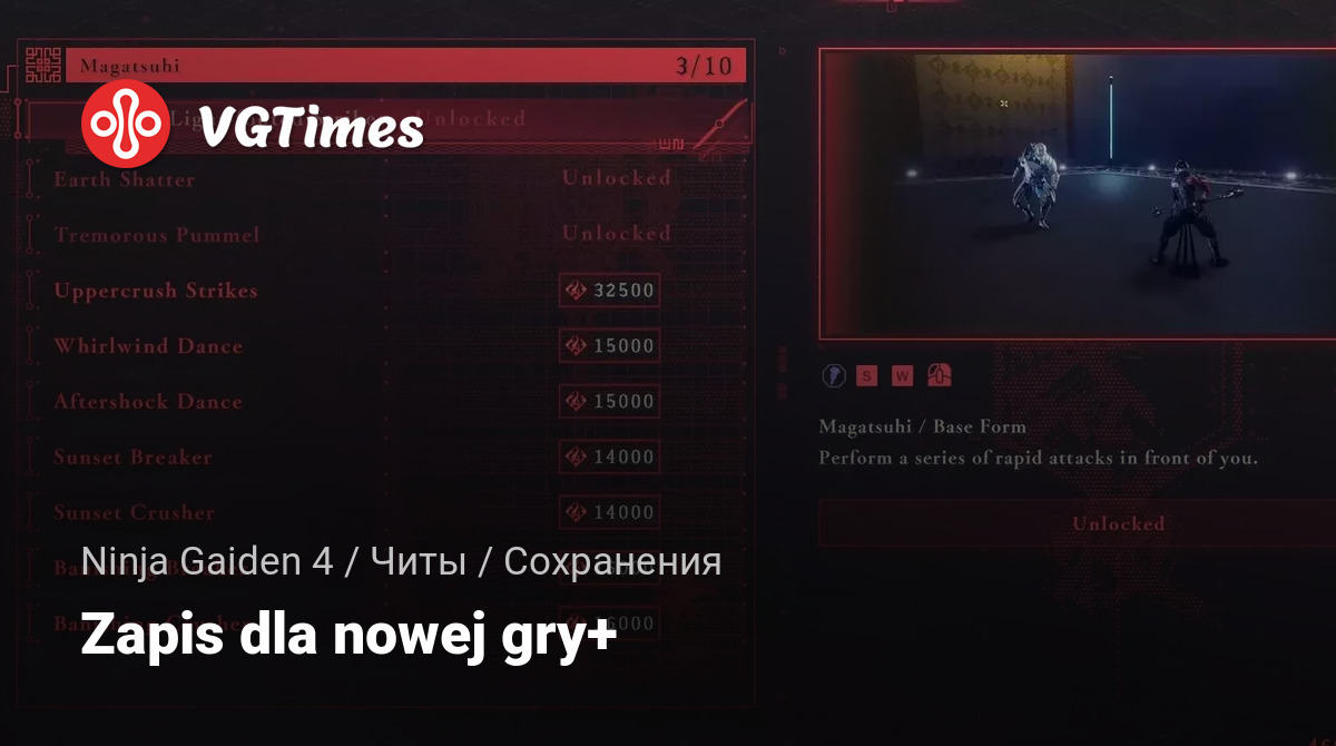 Это сохранение, готовое для New Game Plus. Все испытания разблокированы. Испытания в чистилище разблокированы. Испытания с боссами разблокированы. Режим Master Ninja разблокирован для сюжета и всех испытаний. Все боевые искусства разблокированы. Рю разблокирован. Первые 2 оружия полностью улучшены. Максимальное количество предметов в инвентаре. 446 000+ NinjaCoin. 350 000+ карма.