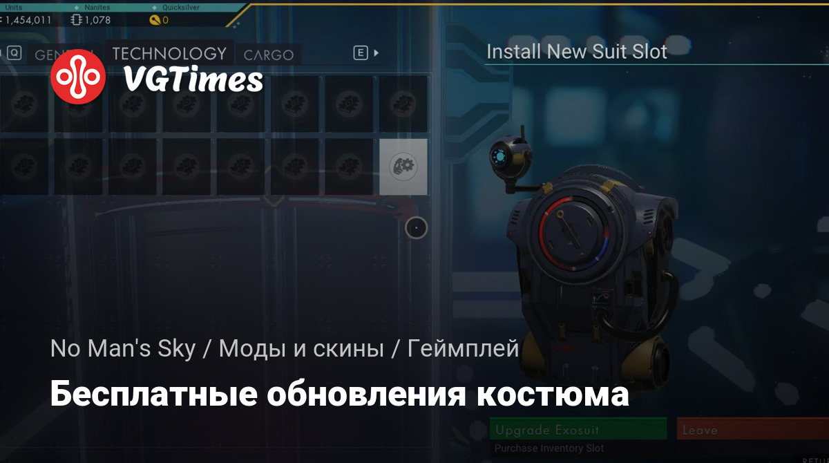 Делает обновления слотов для экзокостюмов бесплатными и повторяемыми. Тем не менее, Free Suit Upgrades — это то, что говорит название, обновление экзокостюма ничего не стоит на космической станции, и нет необходимости летать в бесчисленное множество различных систем для обновления, так как действие повторяемо. Капсулы десантных костюмов, найденные на поверхности планет, позволяют многократно взаимодействовать.