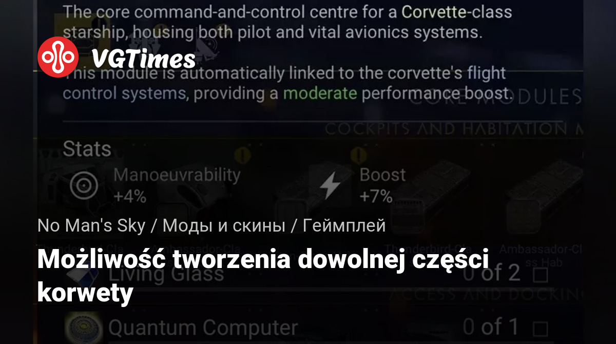 Jest jeden szczegół. Idea moda polega na tym, że kupujesz część, „uczyłeś się” jej, i od tego momentu możesz ją samodzielnie wytwarzać. Jednak to nie działa od razu, ponieważ gra początkowo odblokowuje wszystkie części w katalogu. Dlatego, aby wszystko działało poprawnie, usuwam wszystkie części korwety z tych znanych na początku gry. Działa to tylko przy tworzeniu nowego zapisu z powodu specyfiki pracy z poznanymi schematami i plikami zapisów. Aby w pełni wykorzystać możliwości moda, zdecydowanie zaleca się rozpoczęcie nowej gry.