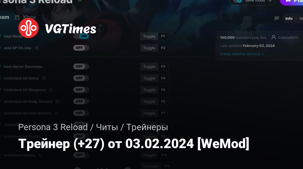 • Persona 3 Reload — Трейнер (+27) от 03.02.2024 [WeMod]