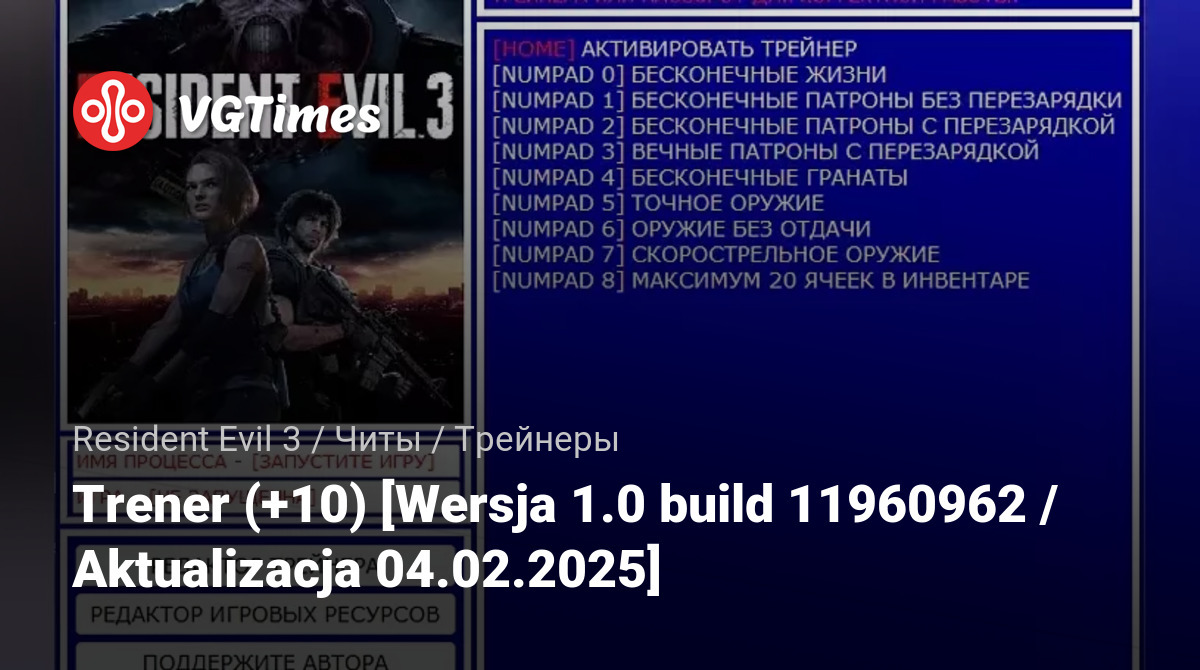 Gry Resident Evil 3 Pliki Trenery Trener (+10) [Wersja 1.0 build 11960962 / Aktualizacja 04.02.2025]
