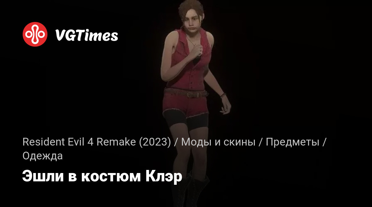 Заменяет стандартный костюм Эшли без пальто на костюм Клэр из RE2R '98. Также помещает голову Клэр на романтический костюм Эшли. Прическа выглядит лучше, если увеличить разрешение до 100%.