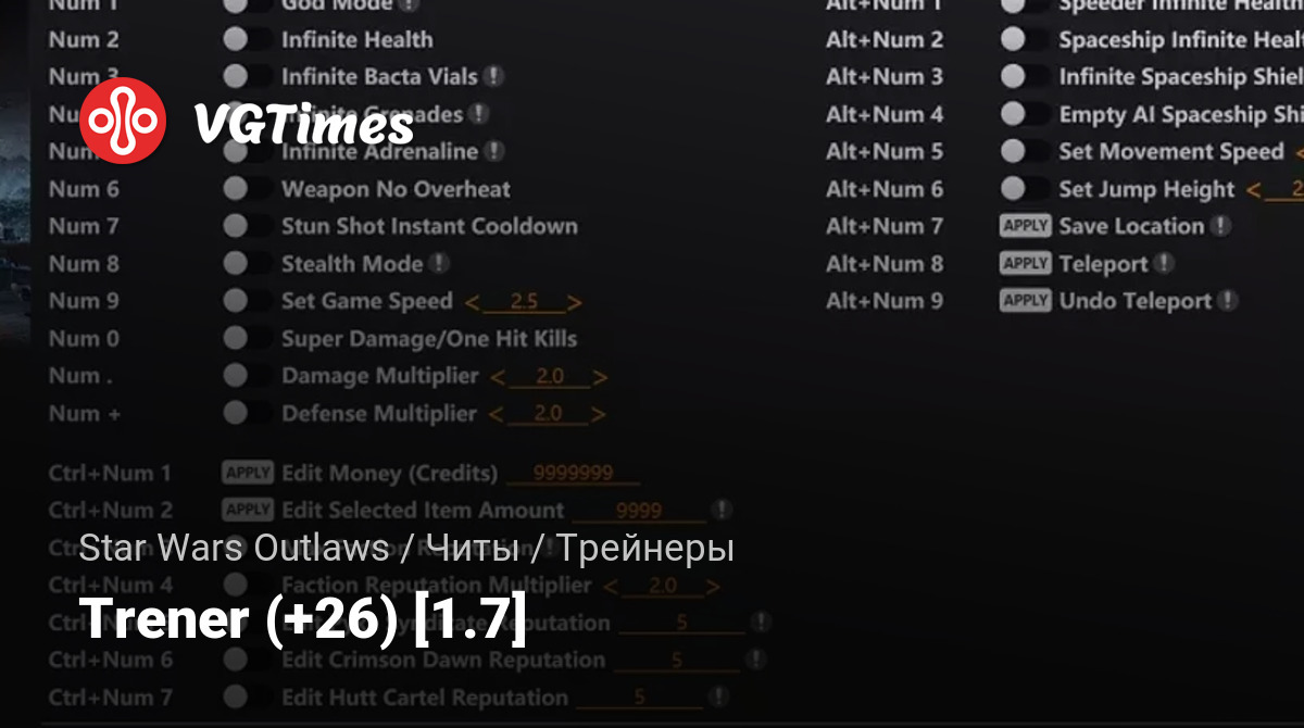 - Ctrl+Num 4 – Faction Reputation Multiplier – Множитель репутации фракции.
