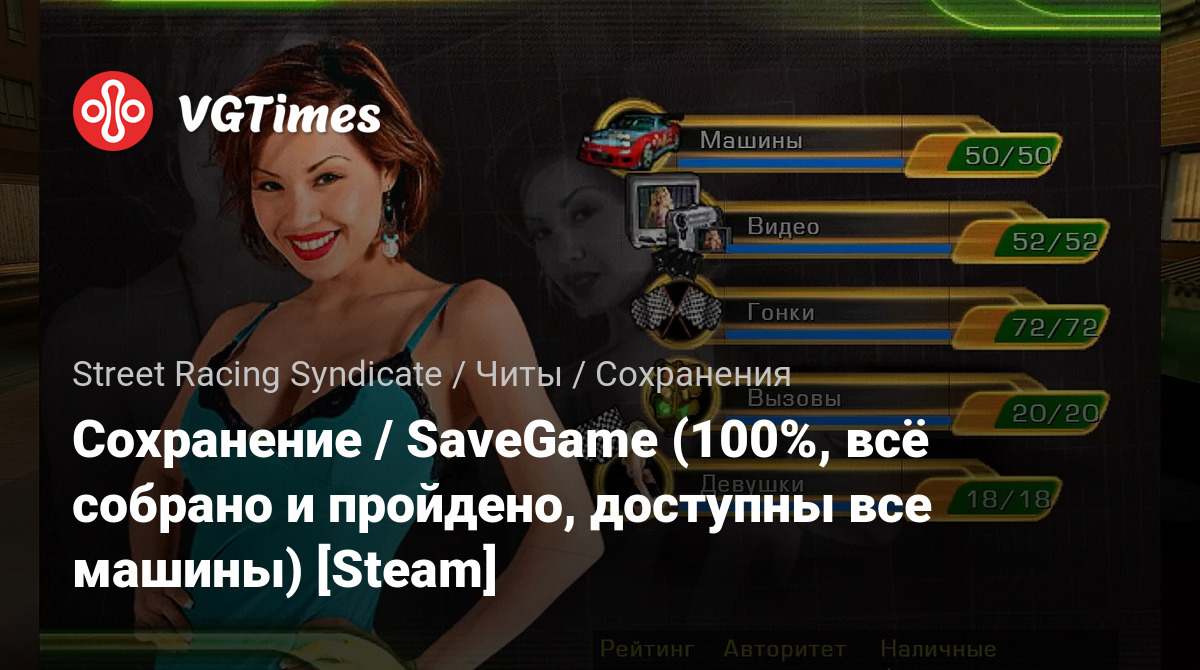 Данный архив, полностью пройдённой игры со всеми испытаниями и девчатами, позволяет начать/продолжить любую гонку на любой машине. Также разблокированы все бонусные авто в игре.