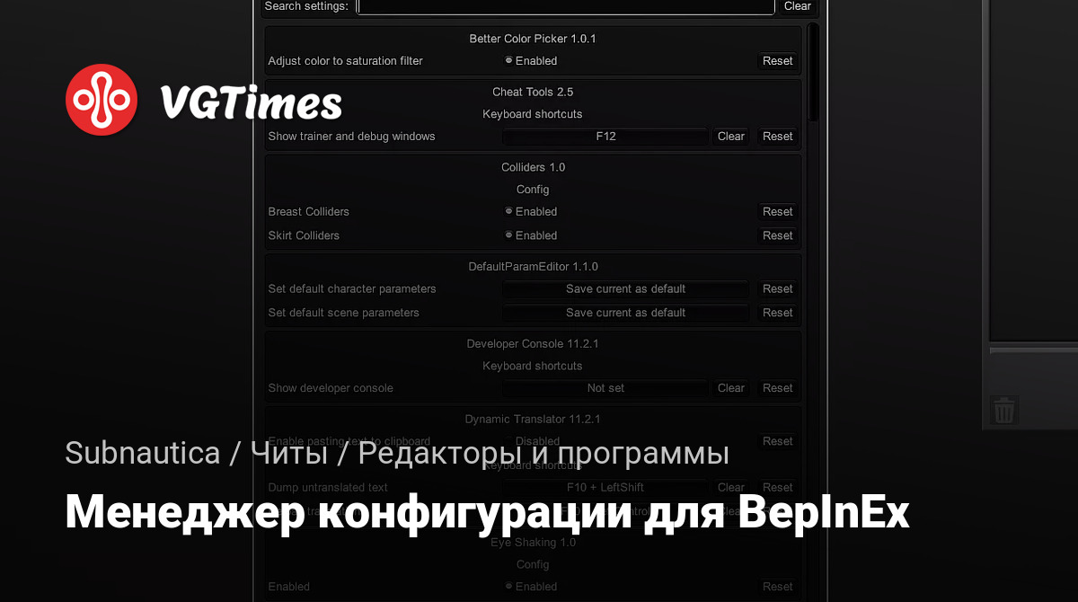 Менеджер конфигурации плагинов / модов для BepInEx 5, настроенный для использования в Subnautica. Простой способ настраивать поведение плагина без необходимости создания собственного графического интерфейса. Пользователь может изменить любые настройки, даже сочетания клавиш.