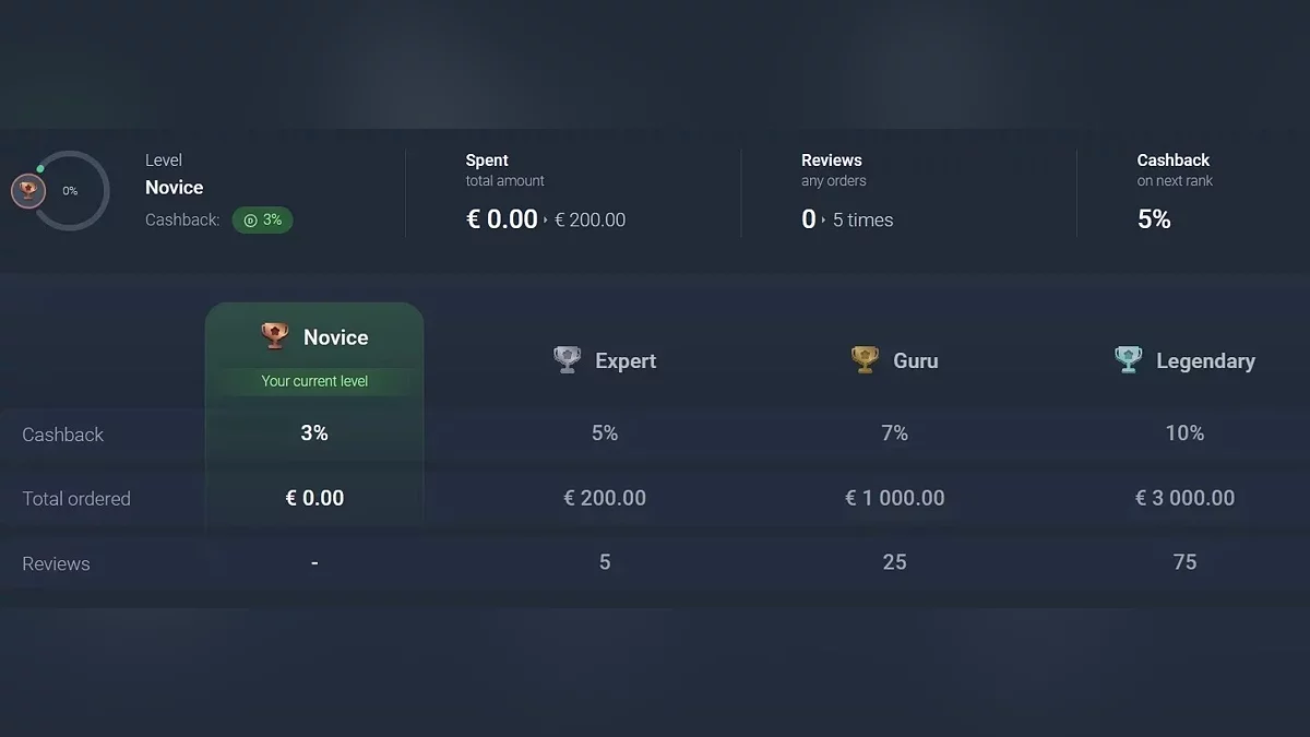 Za każde zakupy użytkownicy otrzymują do 10% cashbacku. Stawka cashbacku zależy od Twojego rankingu na platformie — im więcej kupujesz i interakujesz, tym wyższa stawka.