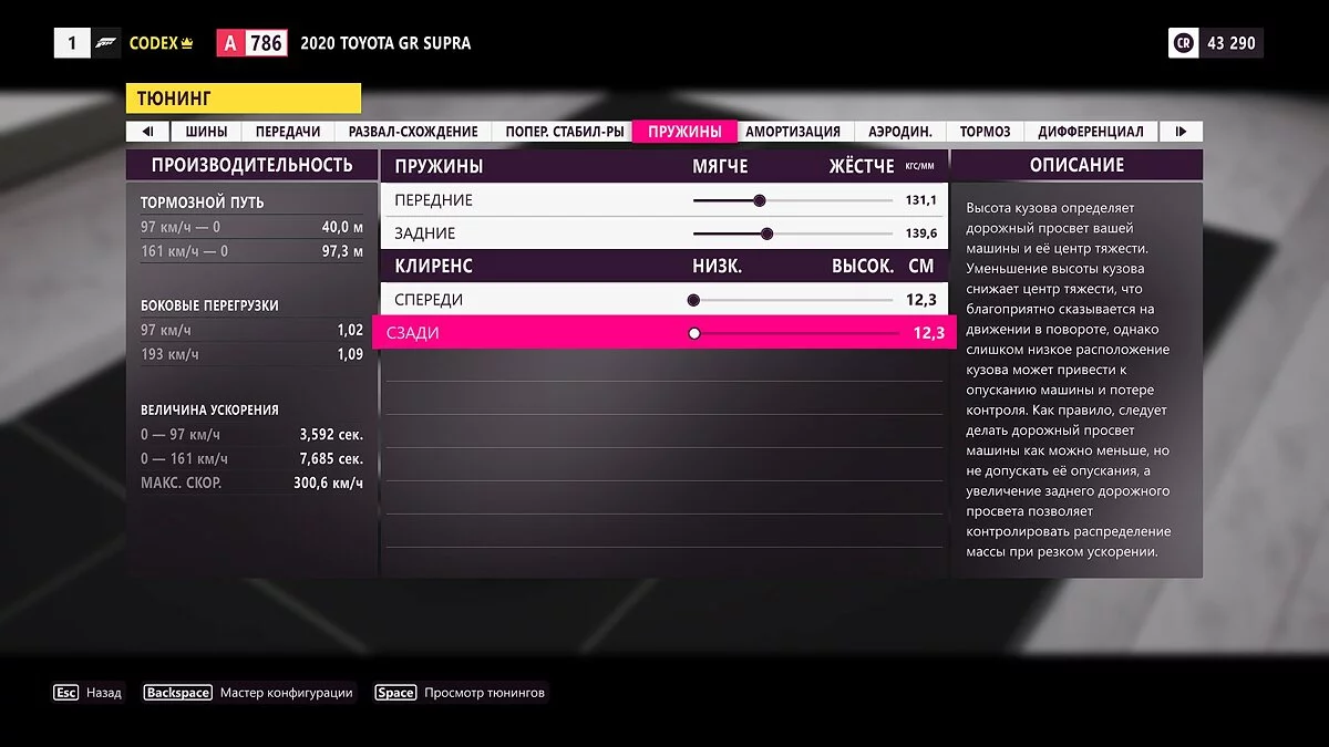 One of the most important parameters for drifting is ground clearance. It can be adjusted in the Springs — Clearance tab. The lower the ground clearance of your car, the better the grip on the road during drifts. It's important not to overdo it, as too low ground clearance can lead to the car bottoming out in corners at high speeds, resulting in a total loss of control. Start with a value of 12.3 on both the front and rear axles and increase it as necessary.