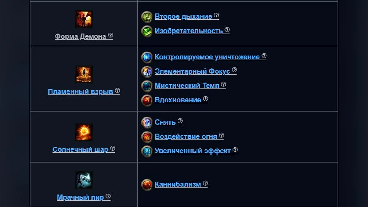 Budowa wykorzystuje umiejętność ascencji Demon Form, używając Flameblast i Solar Orb do zniszczenia wrogów. Budowa używa Demonflame do zwiększenia obrażeń zaklęć, ale wymaga dużej ilości życia i regeneracji życia na sekundę, aby zminimalizować utratę zdrowia.