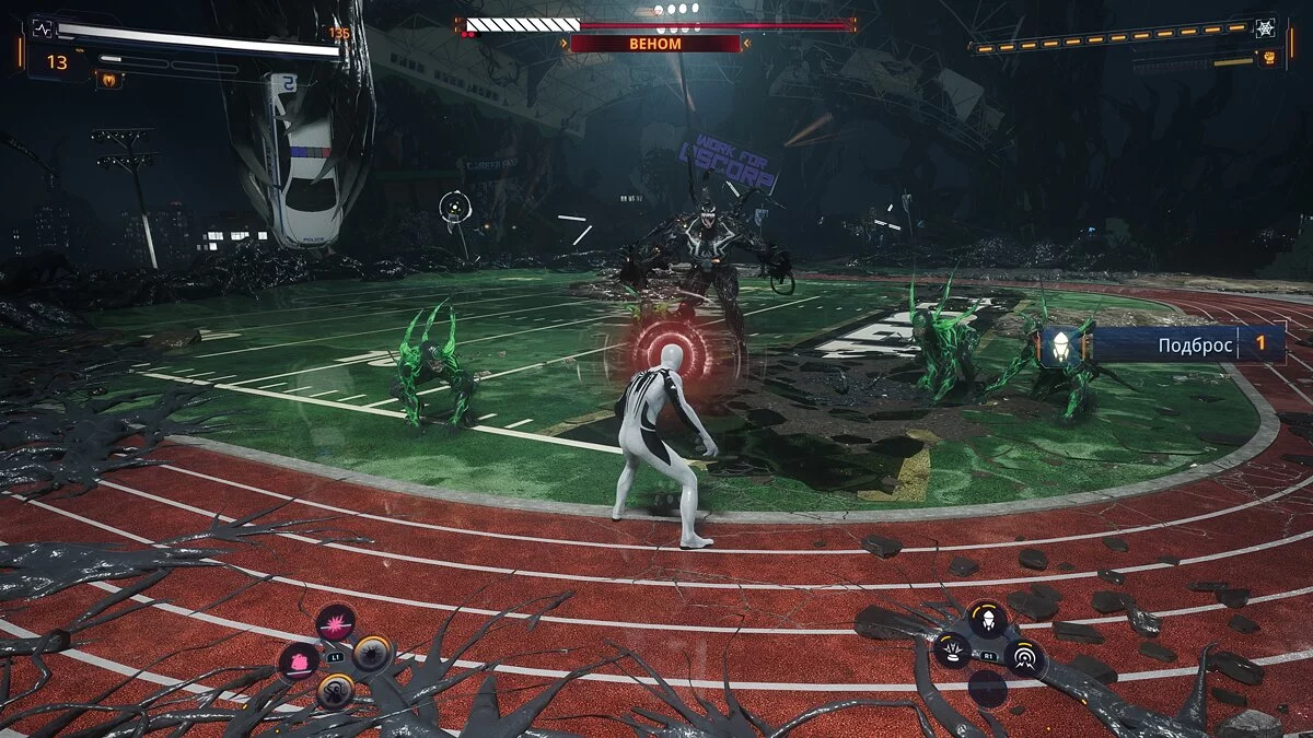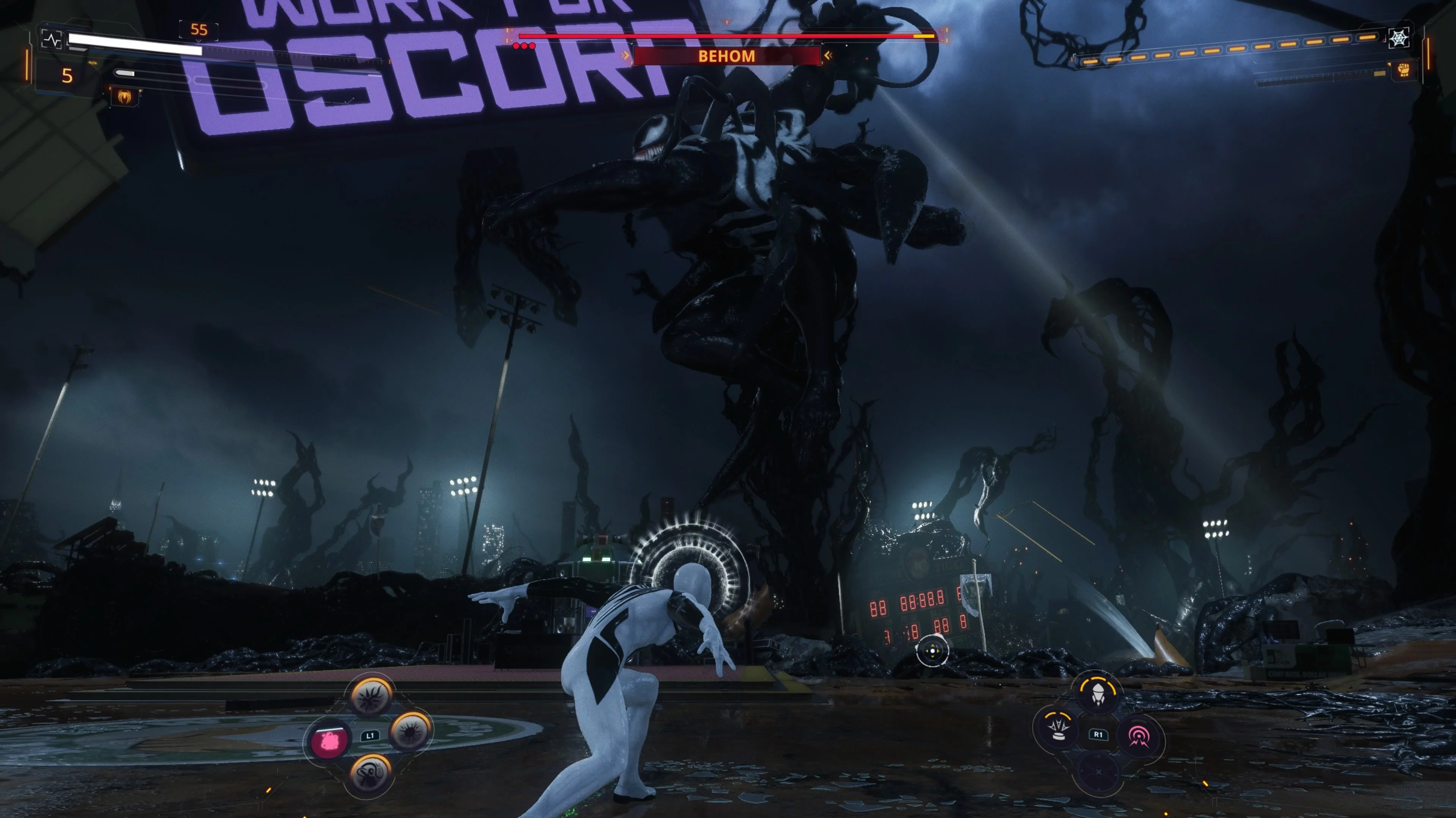 Różne przedmioty na arenie mogą również pomóc ci ogłuszyć bossa. Jeśli uda ci się oszołomić Venoma, uderz go pięściami. Od czasu do czasu potwór zainfekuje ziemię czarną cieczą. W tym momencie ważne jest, aby skoczyć w górę i przenieść się do czystego obszaru.