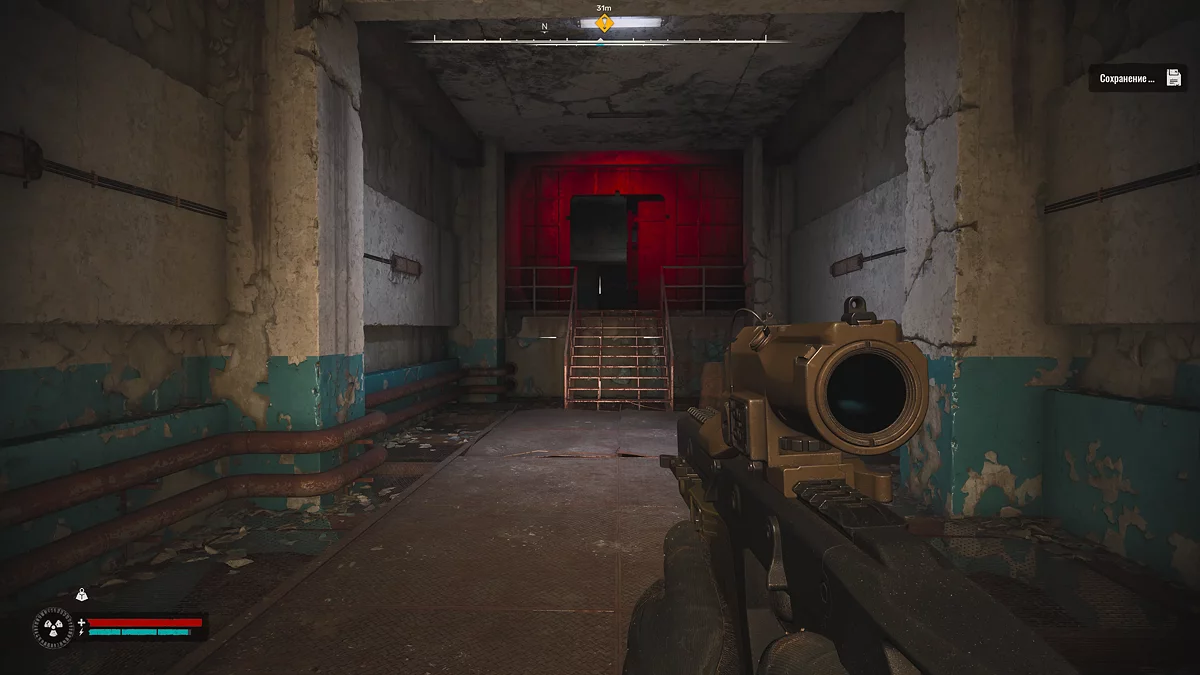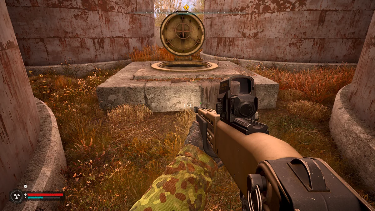 Wejście do kompleksu nie jest daleko od bazy Shcherby. Po zejściu do włazu, podążaj za tunelem. Dotrziesz do spiralnych schodów prowadzących w dół. Po zejściu znajdziesz się w pomieszczeniu z kwasowymi anomaliami. Będzie tam również jedna zombi. Będziesz musiał przejść przez kilka korytarzy, zniszczyć kilka zombi i stado szczurów. W końcu znajdziesz się przy zamkniętych drzwiach. Użyj karty dostępu, aby je otworzyć.