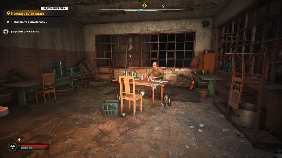 Wypij przynajmniej trzy shoty z naukowcem, prowadząc rozmowę. Po tym opowie ci o innym tajnym kompleksie i postanowi dać ci kartę dostępu. Podążaj za nim. Nagle z gratów Dvupalova wyskoczy artefakt, złap go i porozmawiaj ponownie z naukowcem. Kartę dostępu zabrał ktoś o imieniu Shcherba. Teraz Skif musi go znaleźć.
