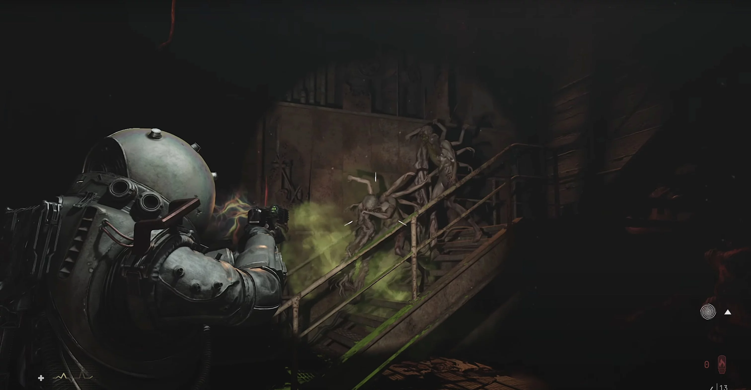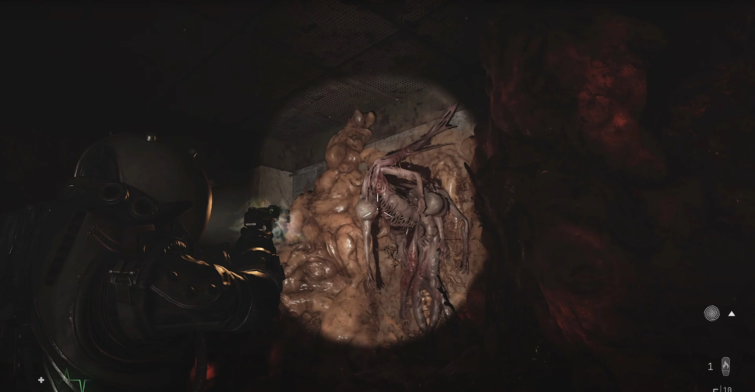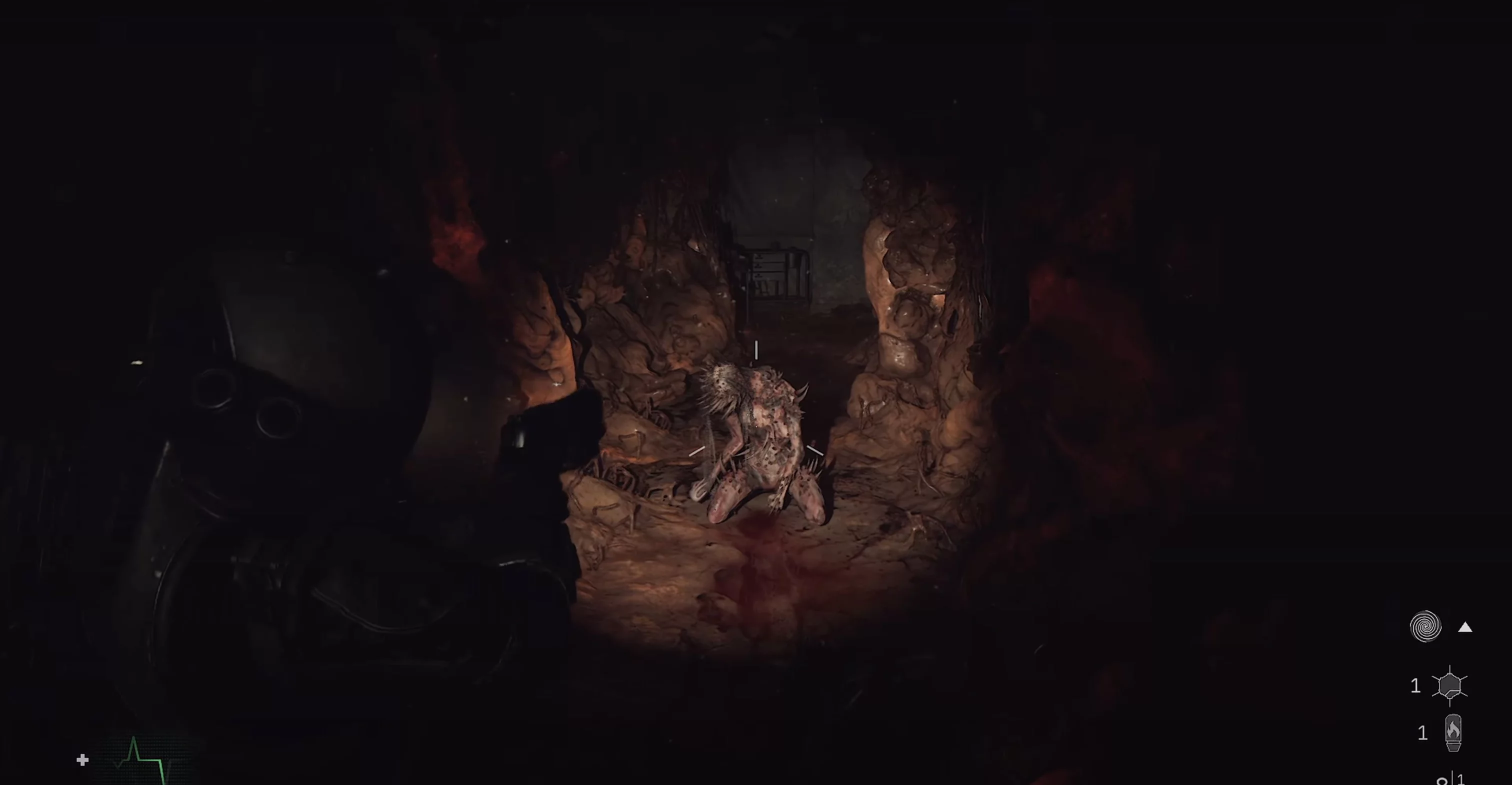 Przed Tobą będzie jeden wróg. W końcu zejdź do tunelu. Weź amunicję do miotacza ognia. Możesz spalić ciała pobliskich stworzeń. Po prawej stronie jest dziura w ścianie. Przeciśnij się przez nią, aby zebrać zasoby i rdzeń.