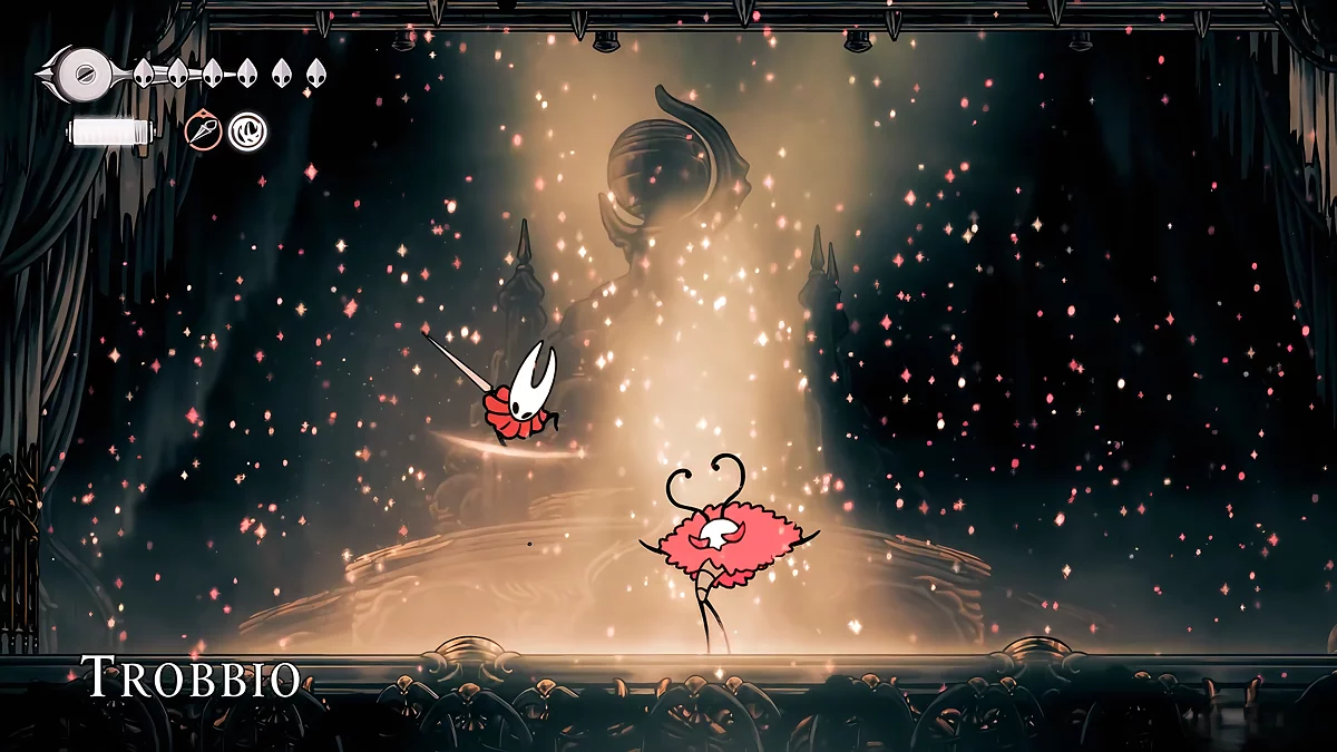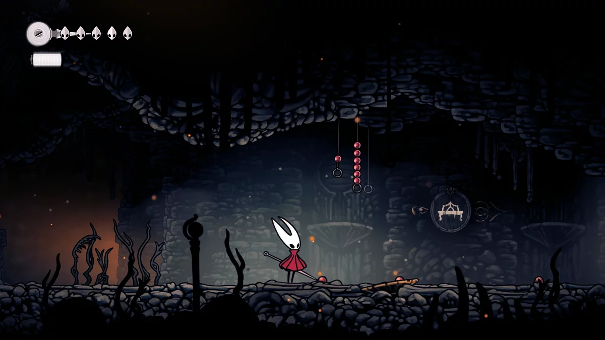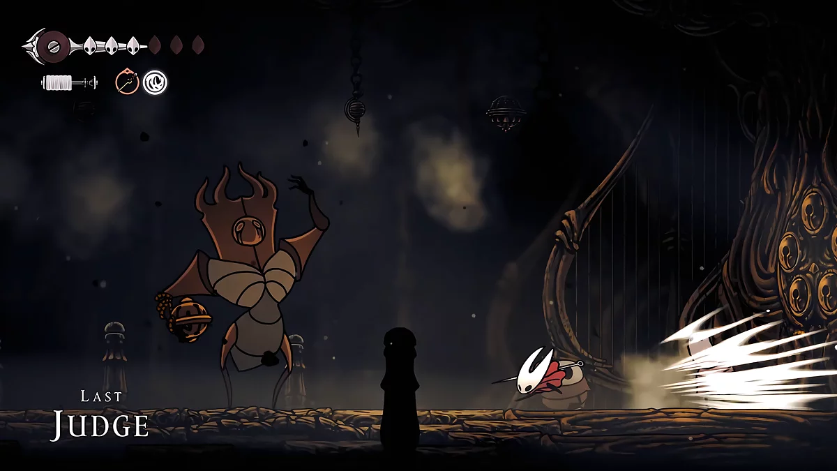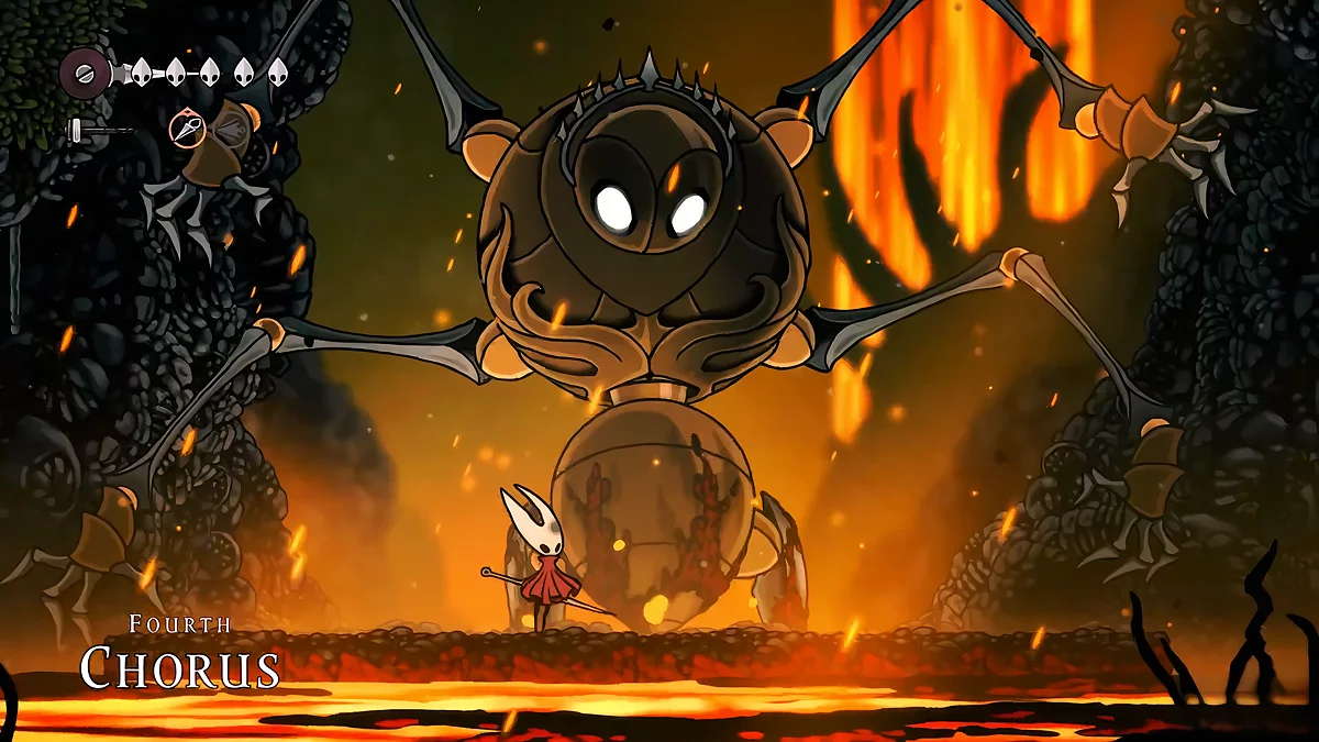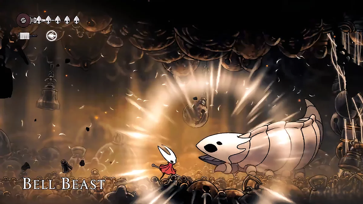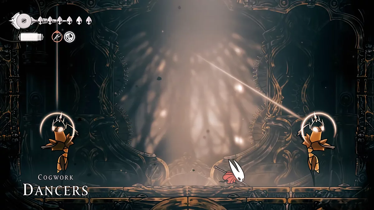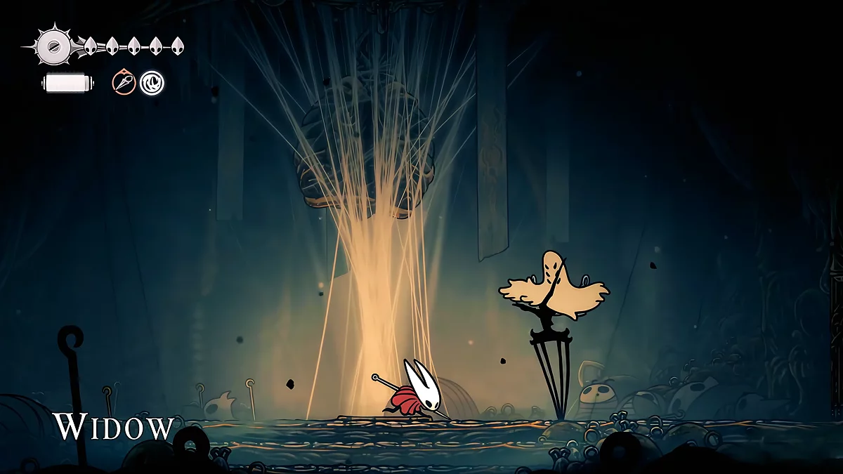 - Igły. W trakcie walki, sześć igieł unosi się nad głową Hornet. Główne ataki Matki polegają na rzucaniu szpilek w różnych kierunkach. Kiedy igła leci poziomo, możesz się od niej odbić. Dodatkowo, przed tym ruchem, pociski błyszczą białym blaskiem. Unikaj ich i staraj się jednocześnie atakować bossa.