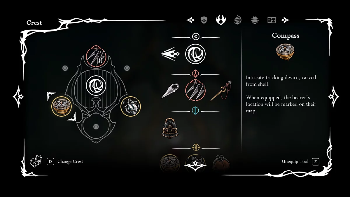 - Wybierz swój ekwipunek. W większości przypadków Hornet zginie w pierwszej walce. Dlatego przed ponownym udaniem się do bossa otwórz swój ekwipunek, przekaż talizmany, umiejętności, narzędzia i uzupełnij swoje zapasy.