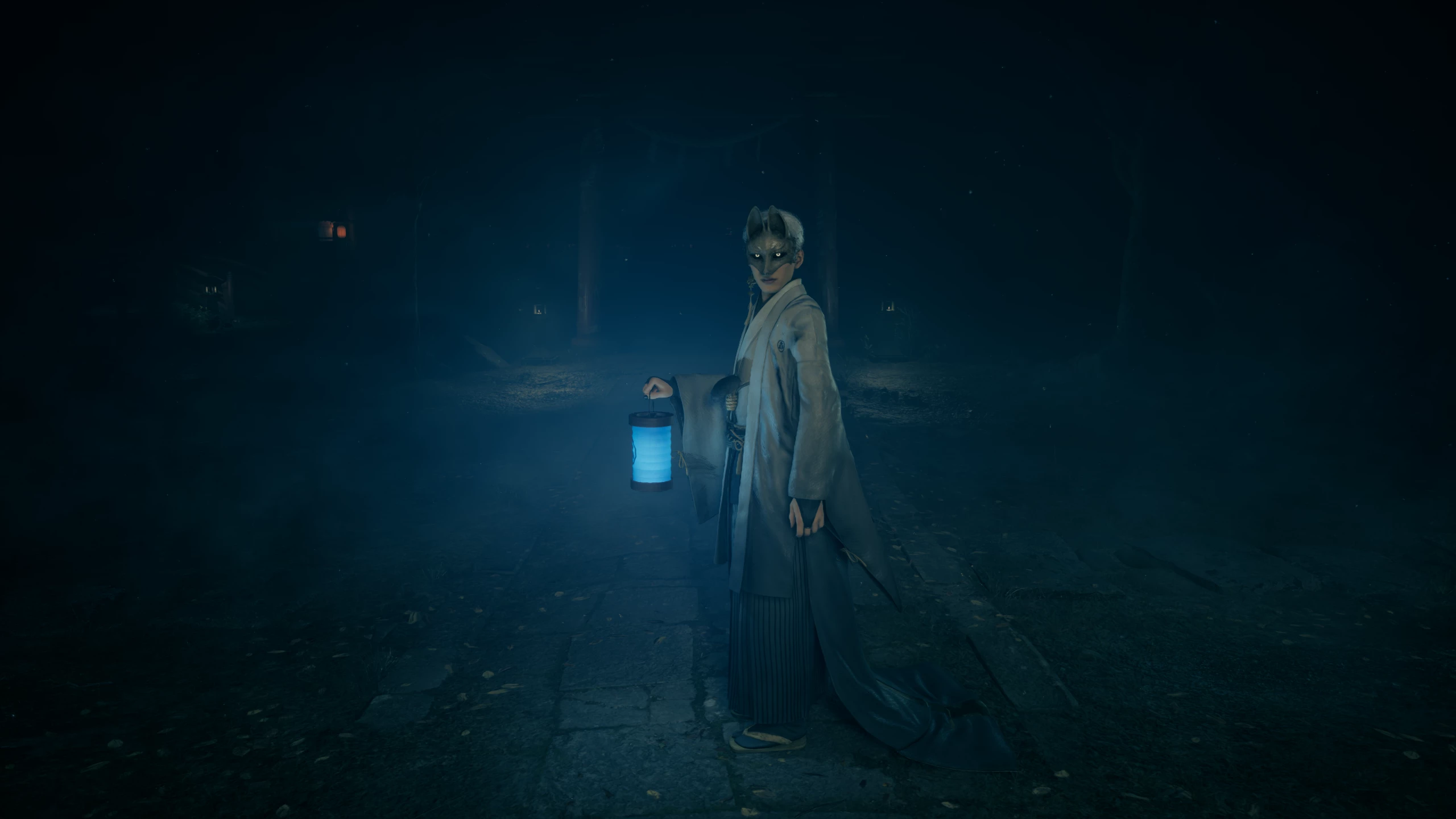- Rytuał Hinako z mężczyzną w masce lisa w ciemnym sanktuarium.