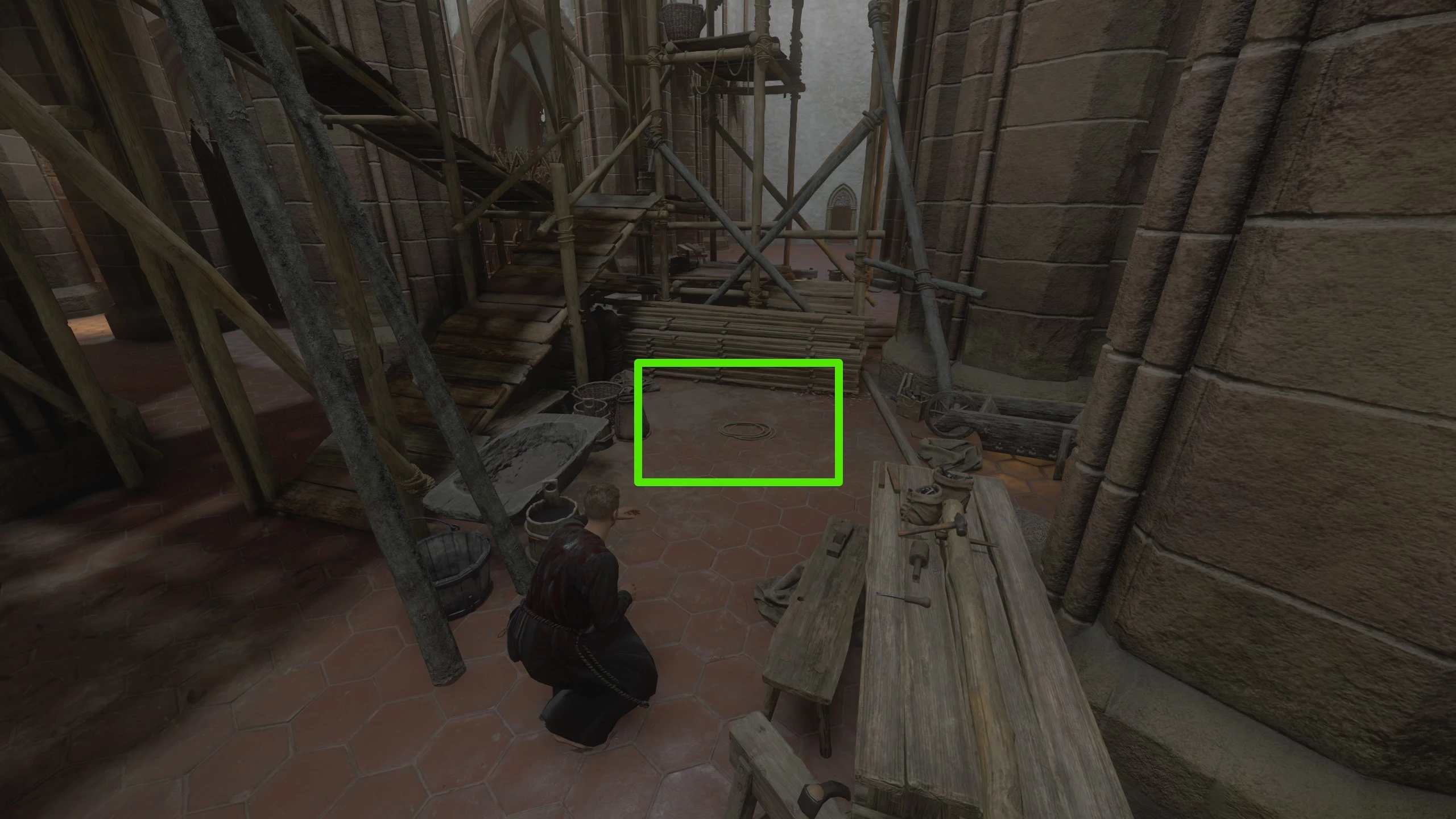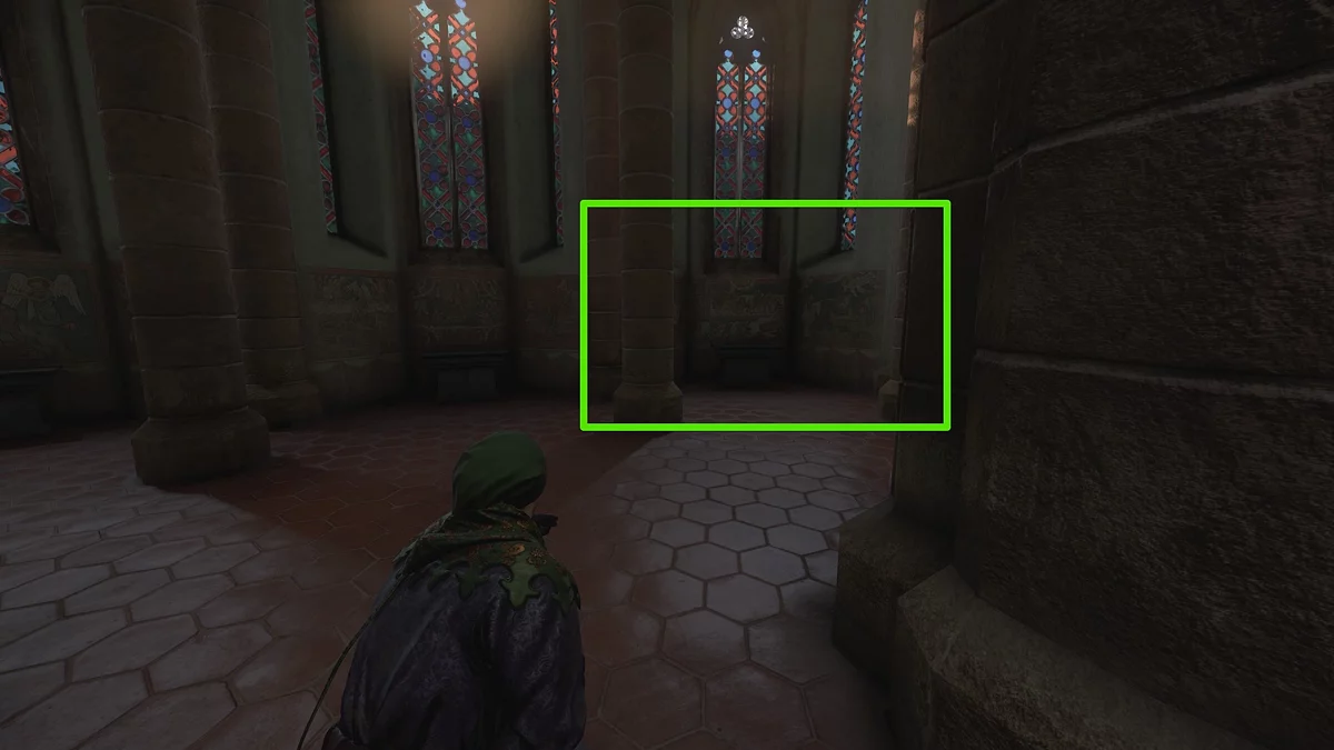 Teraz udaj się do ołtarza, gdzie trwają prace naprawcze. Pamiętaj, że jak tylko zostaniesz zauważony, zostanie podniesiony alarm. Obejdź rusztowanie i podnieś linę z bastu w pobliżu windy.