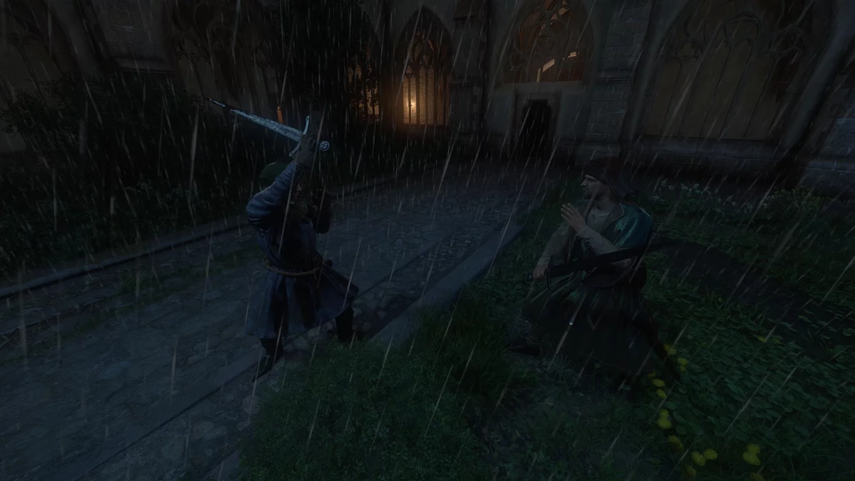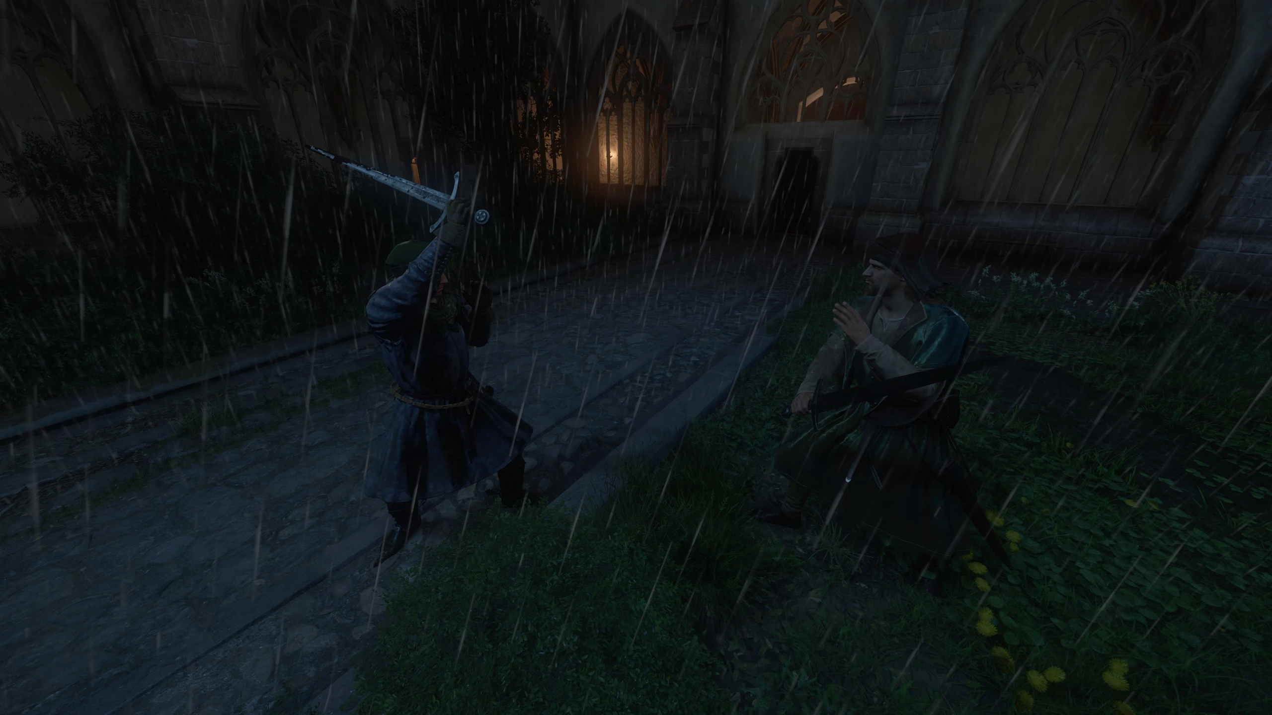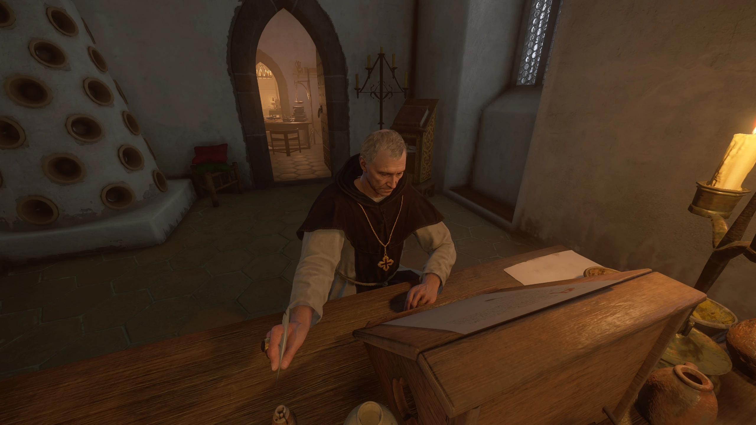 Obron się przed trzema najemnikami, wyjdź z cmentarza, gdzie spotkasz braci, którzy zaprowadzą cię do opata. Skłam o relikwii i przejdź trudny test perswazji. W każdym razie Jan wybaczy Henrykowi zabójstwa na świętej ziemi i wyśle go do szpitala, pozwalając mu również zatrzymać miecz.